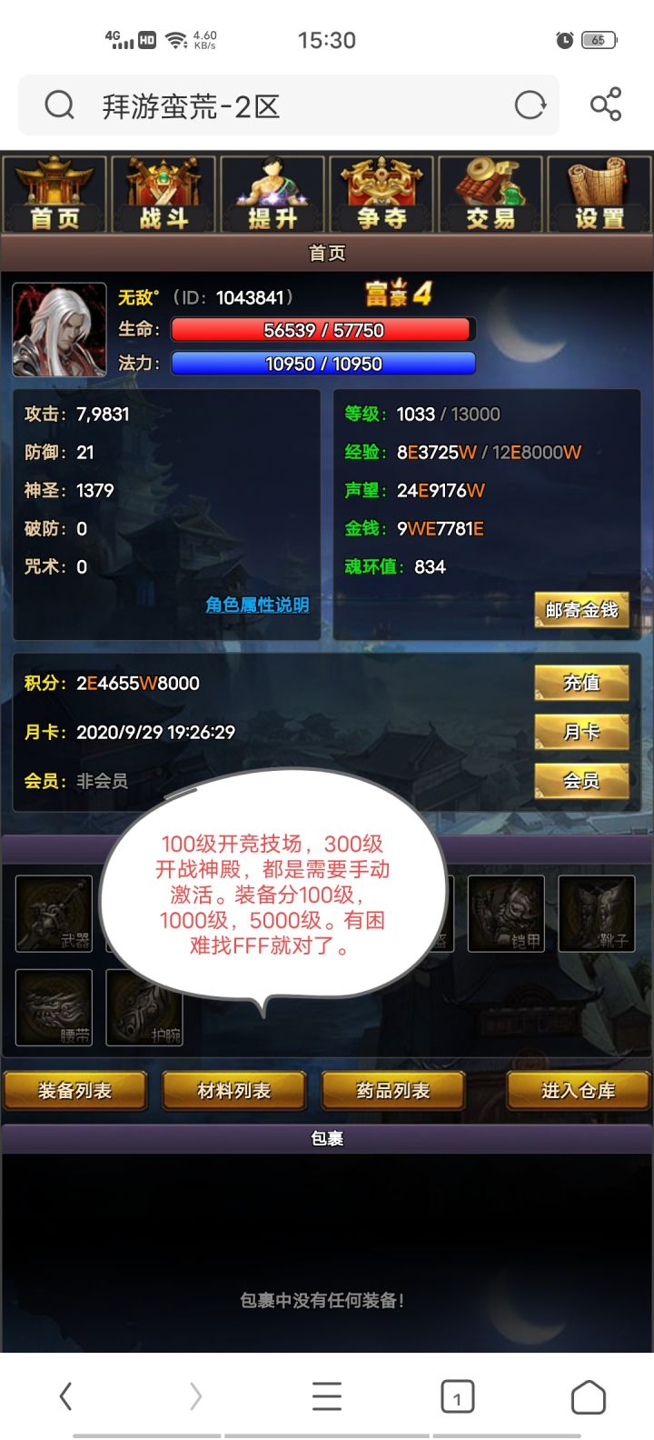 我想到什么就写什么。。记得加群:724146637。(登入界面有显示)1.每天的白嫖签到,需要先认证 ,认证成功可以让你到富豪2.比例:点券 × 1 = 积分 × 1000 2.傀儡.没300级就先点经验,记住不要点太狠(壕哥直接拉满)点个一两百就够了,然后去剧本挂机升级,难度那些看简易攻略。到了100级,群里喊FFF拿新手福利 100E 买药用。挂到300级 记得开战神殿。竞技场也是需要手动