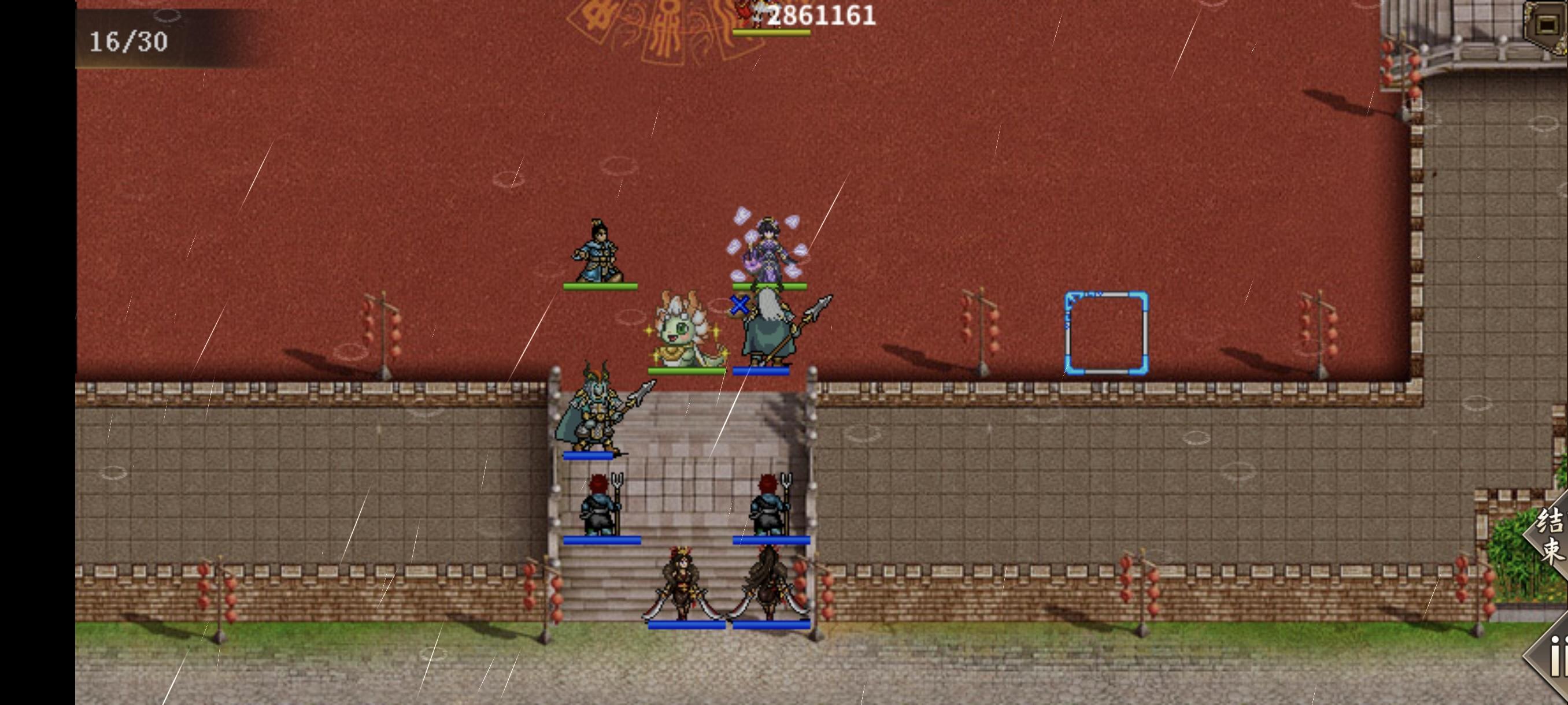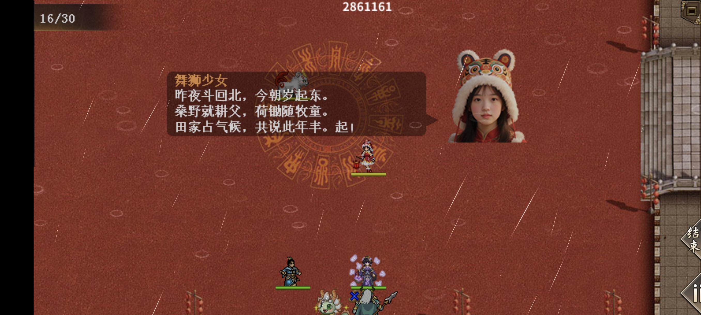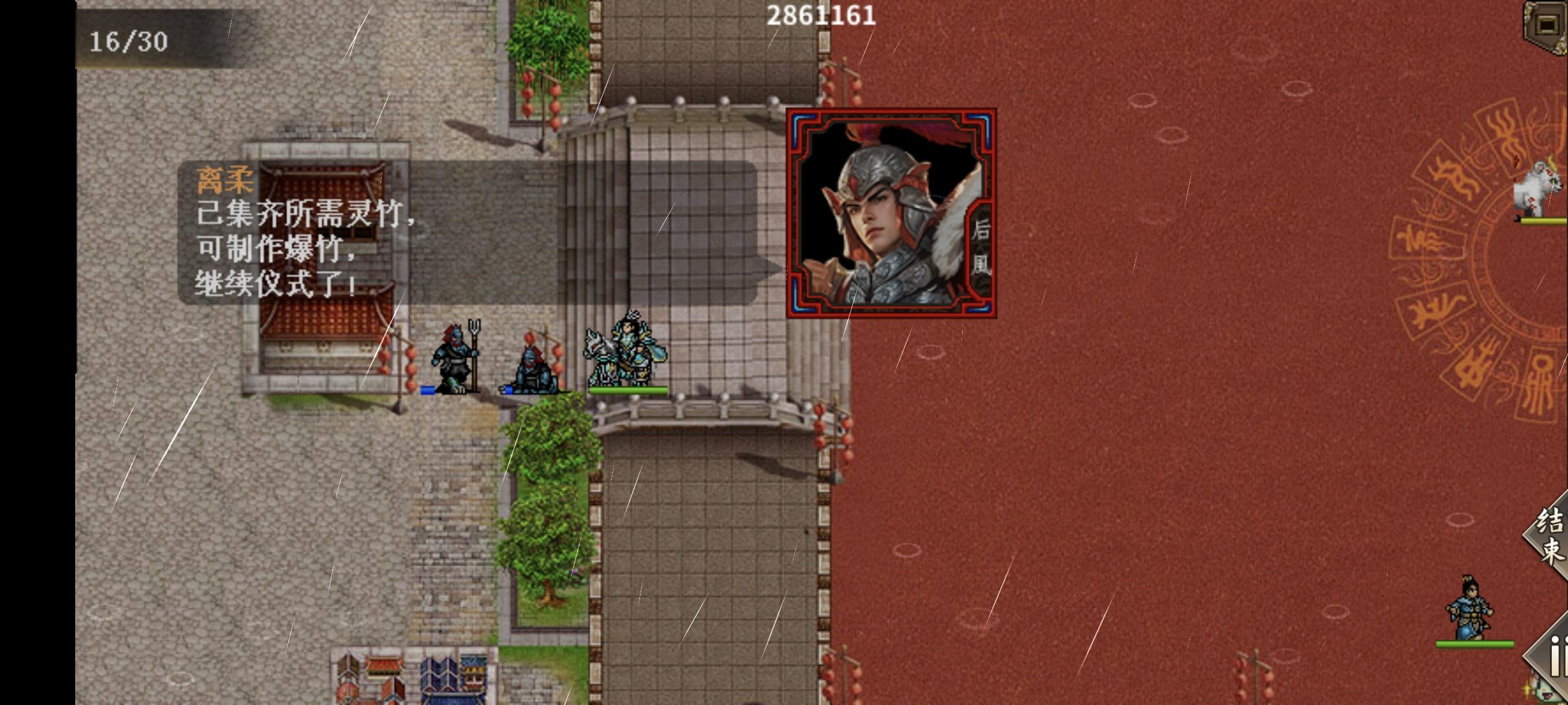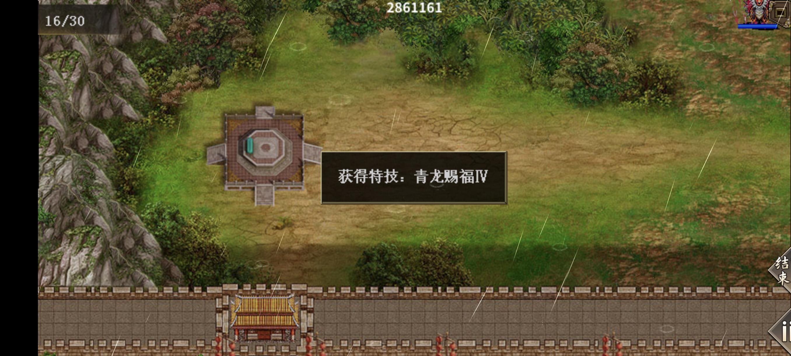 #元旦攻略 此活动是一个守塔关卡类似主线守城敌军无限复活共东南西北四方敌人,敌人1,类似袁华的渔人,特技是固守,三刀杀死,敌人2,叫什么阿波罗免疫风雷法术,物理和且岩/临然可毒龙杀死敌人3,像凤聪儿的女兵,特技是法力防御,需两刀和法术杀死难度不高每杀1轮四方敌人可获得一个特技,分为青/白/朱/玄123,4不可获得大概8回合左右提示去地图四角收集竹子🎋(人物走到区域即可)收集完毕获得