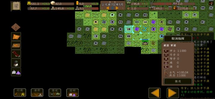 点上面两排图标,有详细说明。变法界面点中间每一排按钮,都有说明。政经点图标。开局什么都别搞,只做三件事。1:招募一点兵捡漏。2:行动点只刷诸子百家。3:变法。招军队前先保存。2000-4000的样子,如果疲劳度导致金负了,就重读,少招募一点兵。捡漏,找1城的打,萌新建议打之前保存。变法点第一排的国主权利,记住!切记!一定留3格,点满行动力上限5,影响称王和其他。然后时刻关注金,