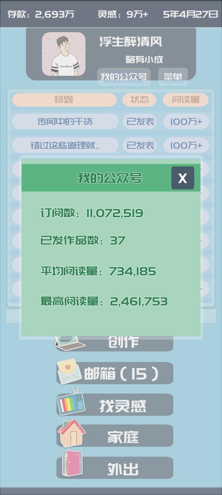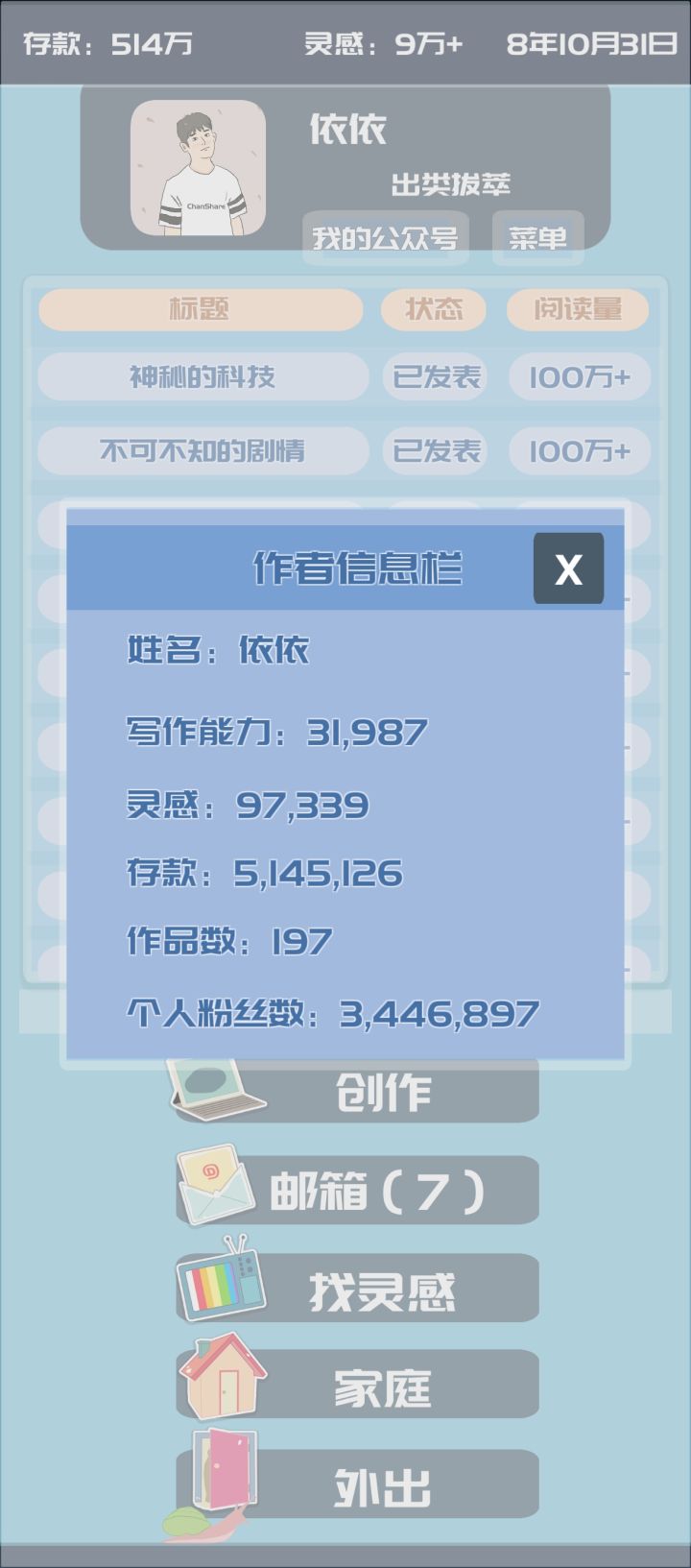 1.刚开始建议屯半个月灵感,因为前期写作能力的不足,前三个公众号所需的灵感在50到150之间。每天会扣除80金钱,建议每收集四天灵感就提升一次写作能力(通过学习)。因为写作能力越高,所需灵感越少。