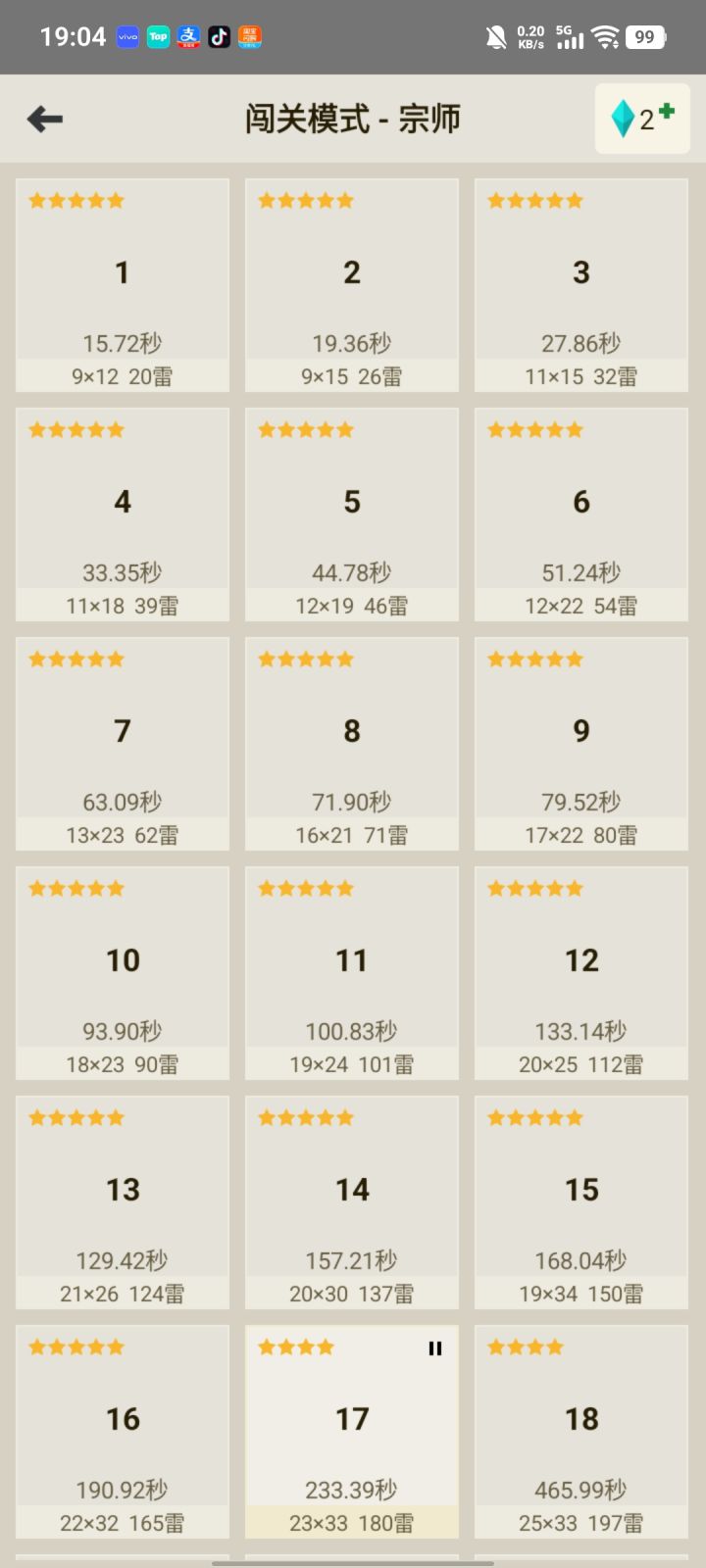 总算全5星了,从入坑扫雷到现在大概有两年了,每天没事就玩玩,这个月疯狂冲,总算把全闯关模式5星