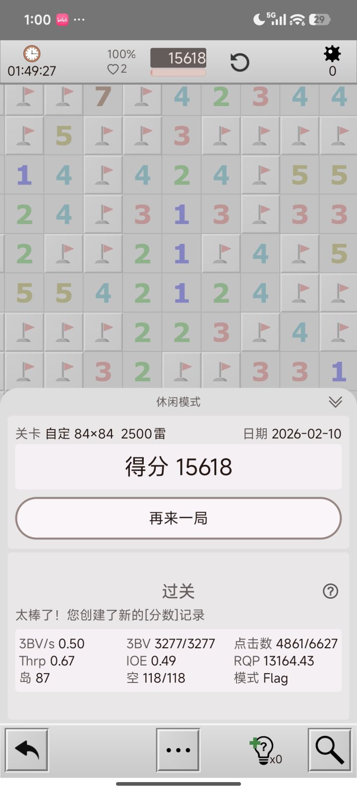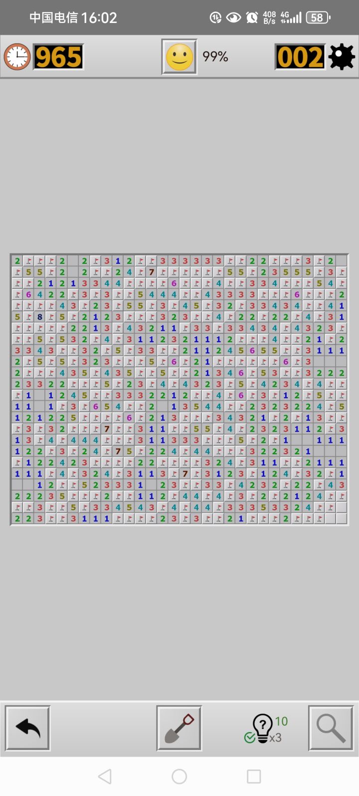 最大地图和最多雷数量,难在很难在点击这么多次后你不点错,而不是算不出来该怎么点。。。。。最近一直在尝试,这是目前完成度最高的一次