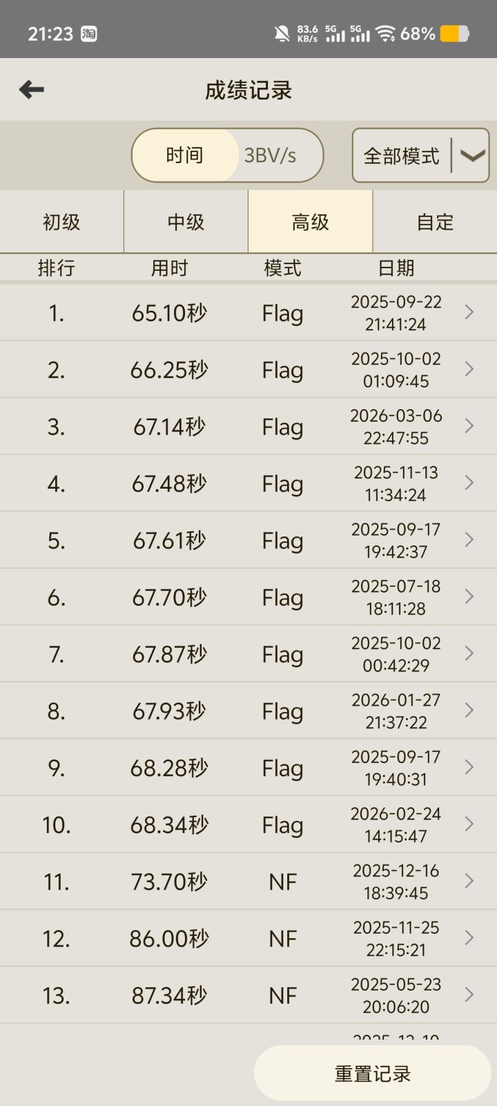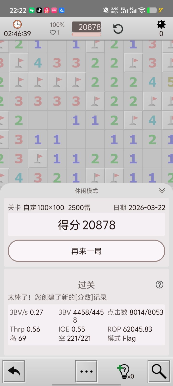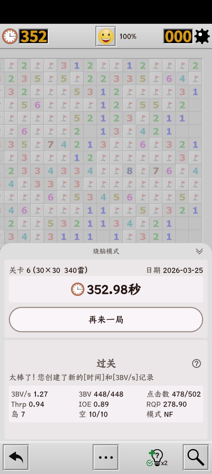 楼主,有一个重大问题,就是你左上角进行了一次主动插旗又取消,我看感觉不像误触,问题就是不插旗挑战在这一刻就失败了呀,这个游戏只要插过旗,完成时的模式就会标注为Flag,你可以用小地图试一下。。。要NF标准就不能插旗,就算是不小心插旗也不行
