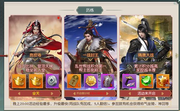 历练系统包含竞技场、边陲之战、国战、隋唐大战、京畿对弈、王者争霸、一战封王、大乱斗。4)隋唐大战1.开服、合服第1天,每周一20:00-20:20;1转并加入阵营的玩家即可参与;2.玩法说明:以帮会为单位,通过击败首领、击败敌国玩家获得胜利;地图上每隔一段时间会刷新一批宝箱,采集宝箱可获得奖励;3.活动开启后点击【参与活动】即可进入楚汉战场,参与活动。5)京畿对弈1.开启时间:开服第