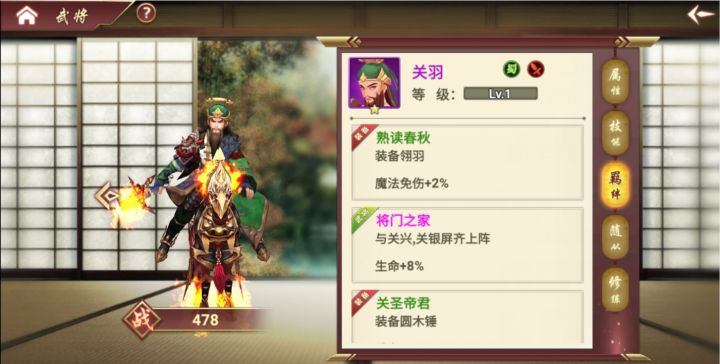 现在来介绍一下什么是羁绊搭配。目前羁绊搭配可分为俩大类:武将与装备、武将与武将。最后这类武将与武将也可视为武将与备战武将。让我们请上目前版本最强---关羽!o(≧ v ≦)o~~1.熟读春秋:装备 战神盔 ,魔法免伤8 这里便是上方提到的第一类——武将与装备。2.将门之家:与关兴,关银屏上阵 ,提高生命8% 为第二类——武将与武将。3.忠义之心:与曹操上阵,抗爆率提高5% 。这里也是为第