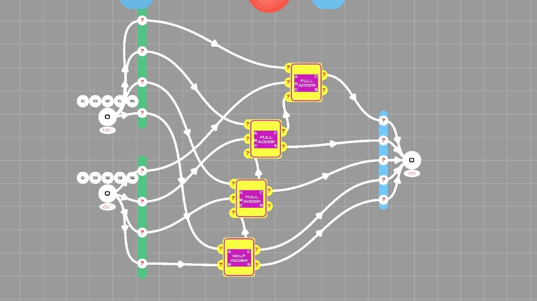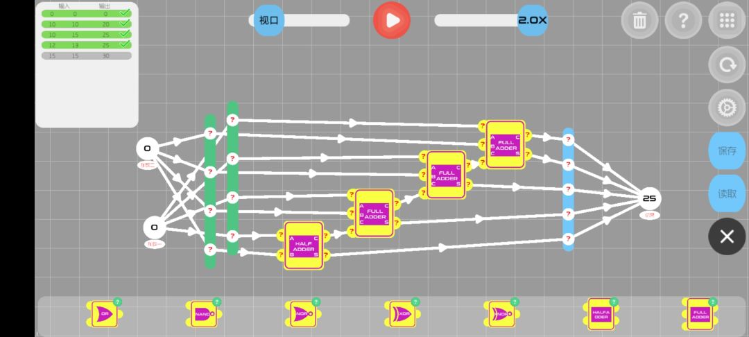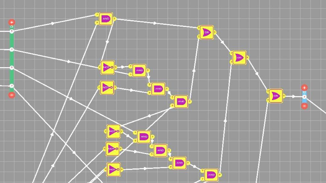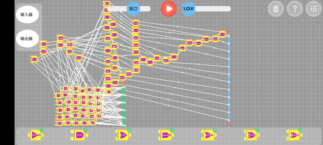 判断部分:获取第一列输出1的and对应的输入器的数值。(我的想法是当任何一个第一列and输出为0时,该项结果为0,任何and输出为1时,该项与原数相同,总结为and门)所以可以将第一列and的结果与对应输入器的每一项形成and门,方便观看,我这是每项为一列and(如图中间16*4个and门)