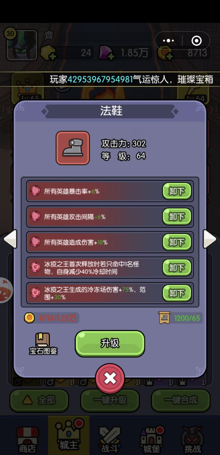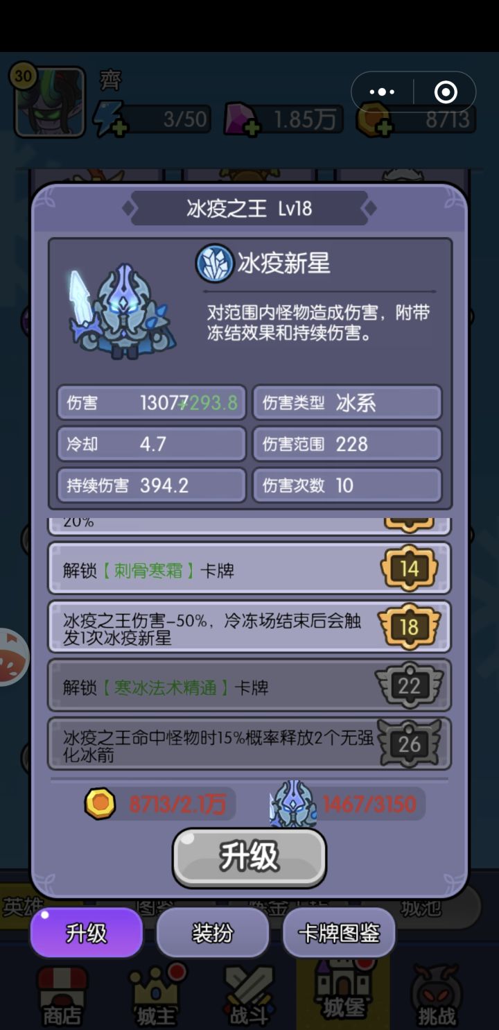 写在前头这是个养老游戏,卡关很正常,提升攻击力搭配宝石突破之前卡住的关卡才是乐趣所在。本人id:644330993893601,金币不要乱花,非常缺,优先升你流派的主角色,冰疫之王风暴德鲁伊两个主控技能,榴弹过护盾傀儡,剩下的点到5级最高9级2,切记奥冰雷风主c英雄确定一个流派,一局只选一个,贪多嚼不烂3,控制很重要,只有控不住的boss没有控不死的boss,伤害不碾压就多选控4,风暴
