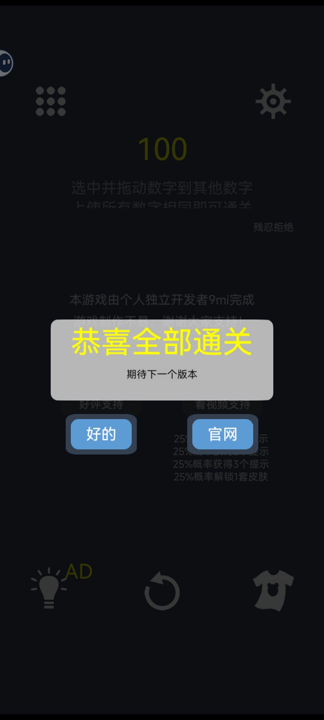 纯心算,没用提示。玩了两天大概一共四个多小时,觉得是一款很不错的益智游戏。可以很好的锻炼思维,主要是推理和运算的能力,看到论坛的大佬们都用代码解决,没办法,咱作为普普通通的高中生只能愣愣膜拜了。看到达人算出来一关有千种可能,还是大为震撼的,但人为解题时有些情况可以通过推理直接排除的,(例如到了最后的80左右的关卡,出现两个相同奇数一个偶数的情况下,一定是分偶数)。关于游戏的解法,与论坛众多大佬