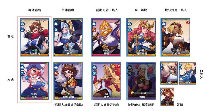 1.阵容 现阶段这游戏有五个普通系:人族 兽族 精灵 矮人 光裔 一个特殊系:暗裔(类似其他游戏的神魔 培养难度高)开局要从五个普通系选一个集中资源培养五系其实各有优点 不存在哪一个种族优势明显 只不过前期阵容都没成型前强度有一点不同 自己喜欢什么种族就玩什么都可以不过尽量选择一个适合自己阵容的输出暗暗很难培养 但暗能提高自己队伍后期的上限常见的暗搭配有光系温蒂 兽族武藏 精灵奥兰多#游戏安利