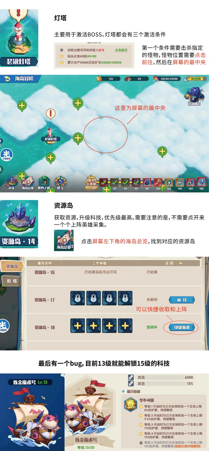 首先是资源岛介绍:资源岛上限20个在大地图用五彩矿石解锁,位置固定,建议先来资源岛开采贝壳硬币升码头,然后再去解锁灯塔,至于为什么下面说。如图所示点亮灯塔需要码头等级要求所以建议先开四个资源岛之后再去解锁灯塔。 灯塔介绍:首领需要点亮灯塔才能挑战,打败首领能获得大量资源所以尽量点亮足够多的灯塔。越往后灯塔的点亮方式越苛刻所以建议先开四个资源岛后在来开灯塔,往后的顺序就是开两个资源岛,开一个