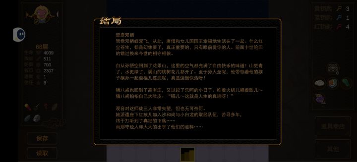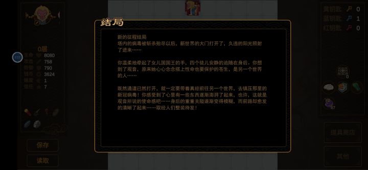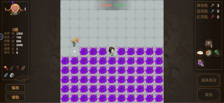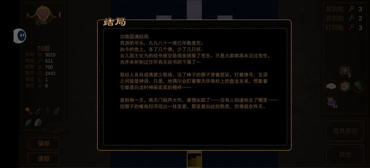 3.多存档,特别上楼有两个楼梯的时候,上去后有时用筋斗云直接跳转另一个能省下不少钥匙,蓝钥匙红钥匙都是够用的,后期适当买黄钥匙就好,59层那要把那八个门都打开才出楼梯