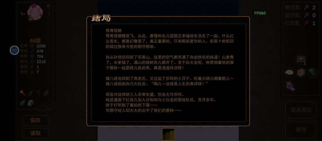 终于通关了,三个结局都打了,钥匙是感觉严重不足,所以在用之前考虑门后面值不值得开,先以爬楼为主,最后有多余的钥匙再开剩下的门。留意有很多暗门,对应坐标大神已经发出来了,对游戏通关有很大帮助。1~8层的东西几乎要捡完才能打赢8层商店门口的老虎,还要考虑捡东西和开门的先后顺序,所以个人感觉8层前比后面还有挑战性一点。8层后就是无脑堆防了,20层前把攻升140+不然石狮子过不去,其他根据地图怪的攻击升防