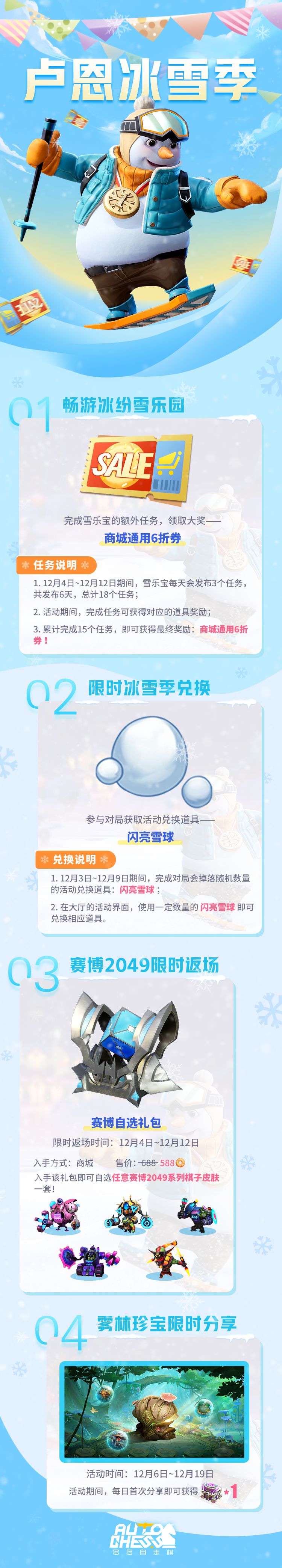 冰雪季到来,怎么少得了狂欢活动? 雪乐宝限时任务、完成对局即可获得的限时兑换道具、 赛博2049冬日返场以及分享即可获得的宝箱, 惊喜尽在卢恩冰雪季!