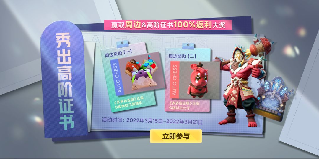 各位棋手大家好: S17新赛季已经上线啦,新的棋士证书闪耀登场!多多自走棋官方团队诚邀大家参与晒高阶证书活动,还有斧王公仔、正版抱枕、甜甜圈等豪礼等你赢取哦~到底是哪些幸运儿能够获得这些奖励呢,多妹可是很期待呢 活动链接在下方哦~
