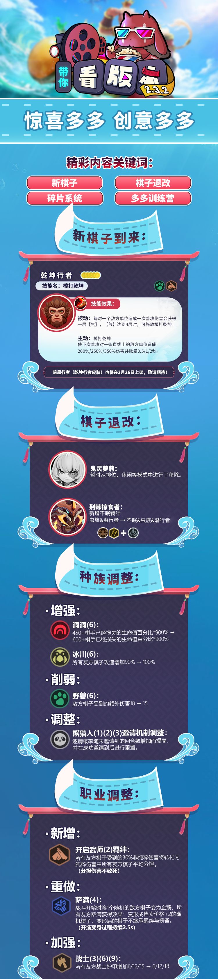 亲爱的各位棋友: 《多多自走棋》正式服将于3月9日 05:00(UTC+8)关闭匹配,06:00(UTC+8)开始进行停服更新维护,预计维护时间5个小时,维护期间暂时无法登录游戏,开服时间会因实际维护情况提前或推迟,请提前安排好您的游戏时间。本次更新内容如下: 【新棋子】 风羽武者 种族:光羽族 职业:武师 品质:稀有 技能:【疾风烈气拳】 风羽武者用疾风包裹双拳,持续10秒。在疾风效果消失或释