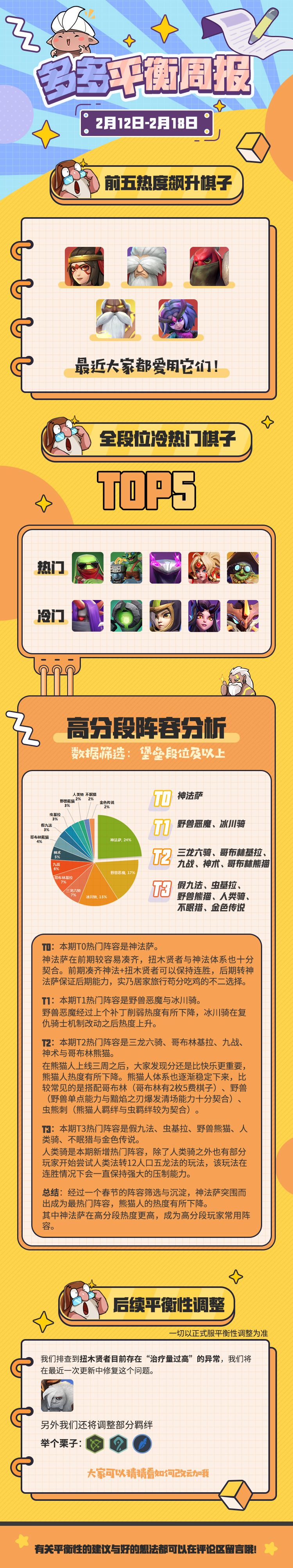 ----- 重要提示 ----- - 扭木贤者治疗过高的异常将在最近一次更新中进行修复。 - 我们发现在最近一段时间内,光羽、猎人、刺客渐渐淡出阵容,棋友们请留意后续的更新,他们是时候重新出现啦!