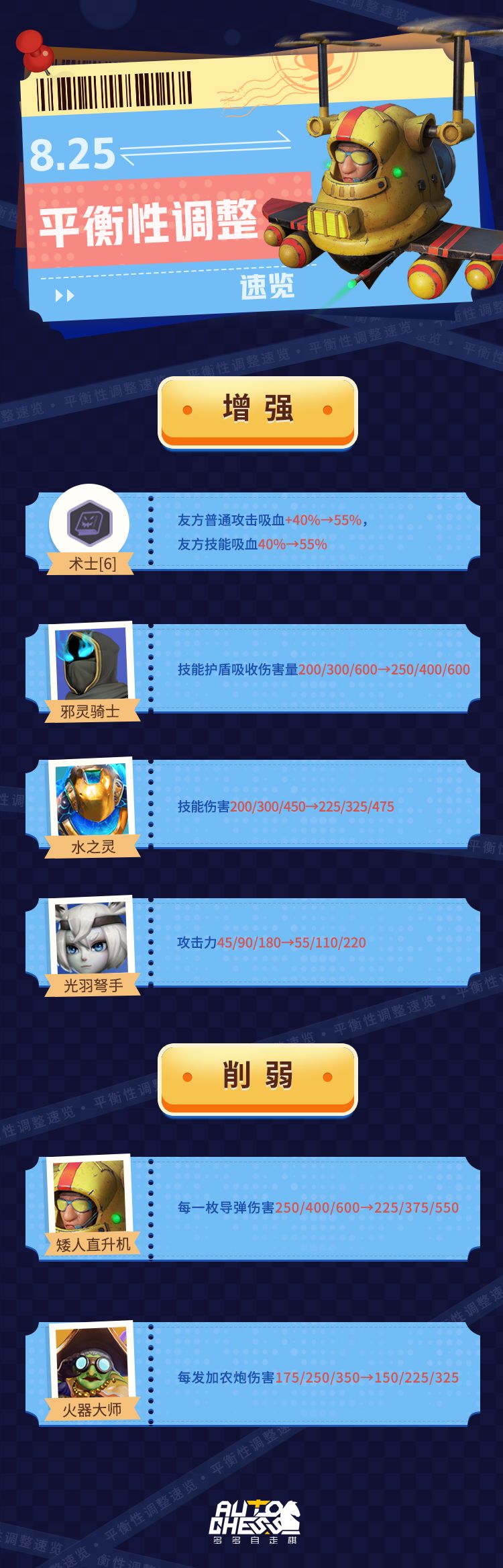 亲爱的各位棋友:《多多自走棋》将于2022年8月25日9:30(UTC+8)进行在线更新,本次更新时间预计1小时,在更新的过程中不会影响您的任何游戏操作。 本次更新内容如下: 【平衡性】 羁绊相关 1.术士[6]:友方普通攻击吸血40%→55%,友方技能吸血40%→55% 棋子相关 1.矮人直升机:每一枚导弹伤害250/400/600→225/375/550 2.火器大师:每发加农炮伤害175/2