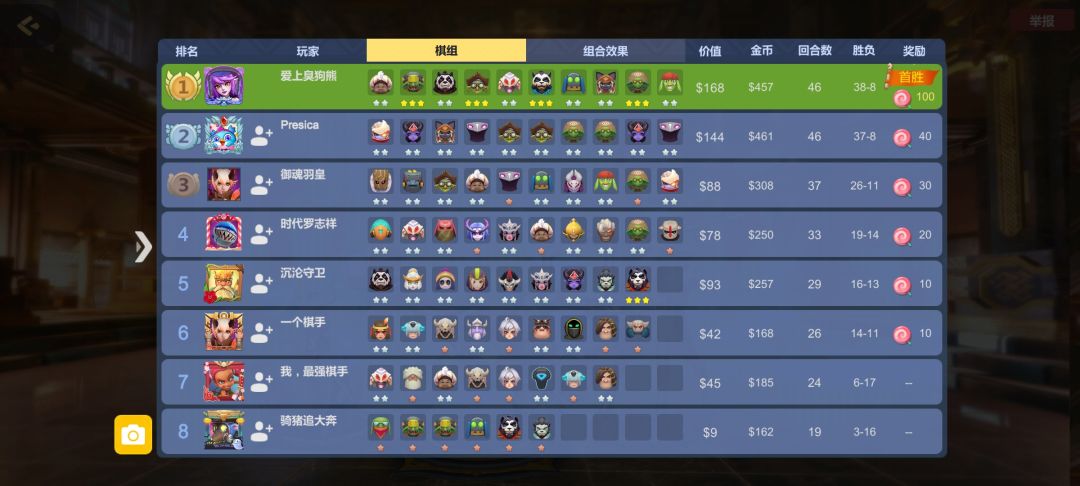 今天玩的是熊猫工匠,前三名都是六工匠,就拼谁先d到炸弹人,我比较早,所以我继续玩六工匠了。(真刷不到也不用硬刷,留足40以上,最好50以上的钱,到了后期不管啥流派其实就是拼经济,拼谁先升人口,谁先d到核心,按我的思路,如果不出我就玩熊猫,反正我的3熊猫也在12回合集齐)
