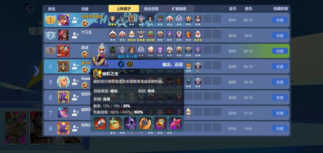 我认为武师不太好弄的原因有两点,一是熊猫的出现有概率,二是死猴子有时候真不知道死哪去了。 但四武师猛就猛在血量减半,直接死亡,根本不给对面呼吸的机会,有时候对面几个关键棋子消失以后就是我们嚣张的时候了。 为了应对不好成型的问题我是先找熊猫然后双巫师凑四武师,先把buff叠上来,对于一些站街队伍比如骑士,洞洞,战士等,有很好的应对。 其次是拿什么和武师配队的问题,这局我是懒了用的熊猫,其实灵族我觉得