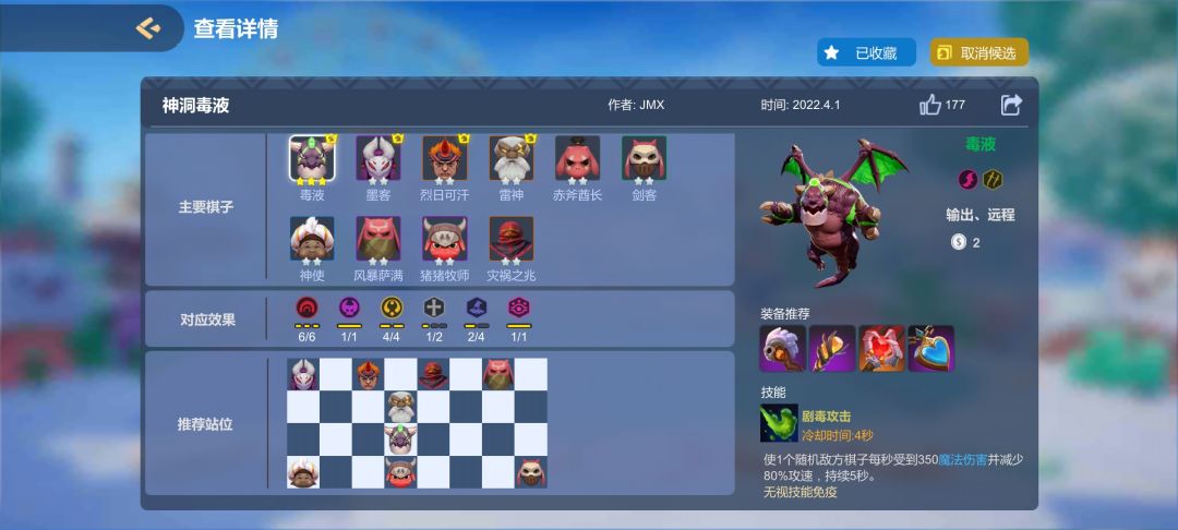 力推一套洞洞神龙 两个月没玩,回来玩了差不多10把。堡垒局,今晚冲国王。感觉就是神龙在至少这种局厉害,牧师和6洞洞容错高稳定吃分,墨客毒龙的完美配合再加装备对基本吃鸡,非常适合我(游戏经常卡) 首先说阵容,大致如游戏内阵容推荐所述,但我是不建议不要门板的,大牛雷神最多要一个来换光女,没有也行。同理没有伊利丹(灾祸洞洞)也能用兽王(洞洞猎人)。整体不太吃5费卡,上限主要在毒龙。 然后是运营,这种局及下推荐直接空城连败,有牧师、熊猫、小鹿(关闭自动合成)可以拿了减掉血和养经济。因为很少一起空的(尤其是赛季末了),不会被断,有一起空的直接预判对空不上怪。注意多多的打野比较困难,10回合最好拉人口6级,质量太低小d一波;15回合注意反向站位防狼。其它问题不大,直接卡50块拉到8级启动,找出整体阵容2巫师4洞洞4神加二星毒龙,最好能出一张墨客,然后再慢慢上10,9级补一张末日最佳。10级成型稳定吃分,稳住运营简单吃鸡。 最后是装备:散件主要需要回蓝,法强,吸血,闪避,10回合前可以不拿装备。 毒龙核心装备是中二杖(法强+吸血,后期合一般优先大中二),大根(回蓝+法强),cd球(2*回蓝,后期不要合刷新),bkb(护甲+魔抗,克制9法、同行、控制等,后期与相应阵容决赛优先大bkb),巫毒杖(2*法强,减疗克制等高吸血治疗核心尤其是哈斯卡,与其打决赛或打不过优先合),版本物理系偏多后期需要缴械(生命+闪避)。 墨客需要开局启动,最好是跳刀(回蓝+闪避),其它多余的加攻击、攻速、回蓝的散件也可以给。 站位大致按游戏内阵容推荐,注意如果给毒龙跳刀不要跳被集火边(所以一般不给,站2,3排稳定输出,墨客要保证打出第一个链子),神使最好能偷关键技能(墨客、巫医、船长等),前中期前置保证偷到近战技能也能用。 如果有更多细节或者错误谢谢大家补充批评指正,赛季末好冲分,祝大家都能早日皇后。