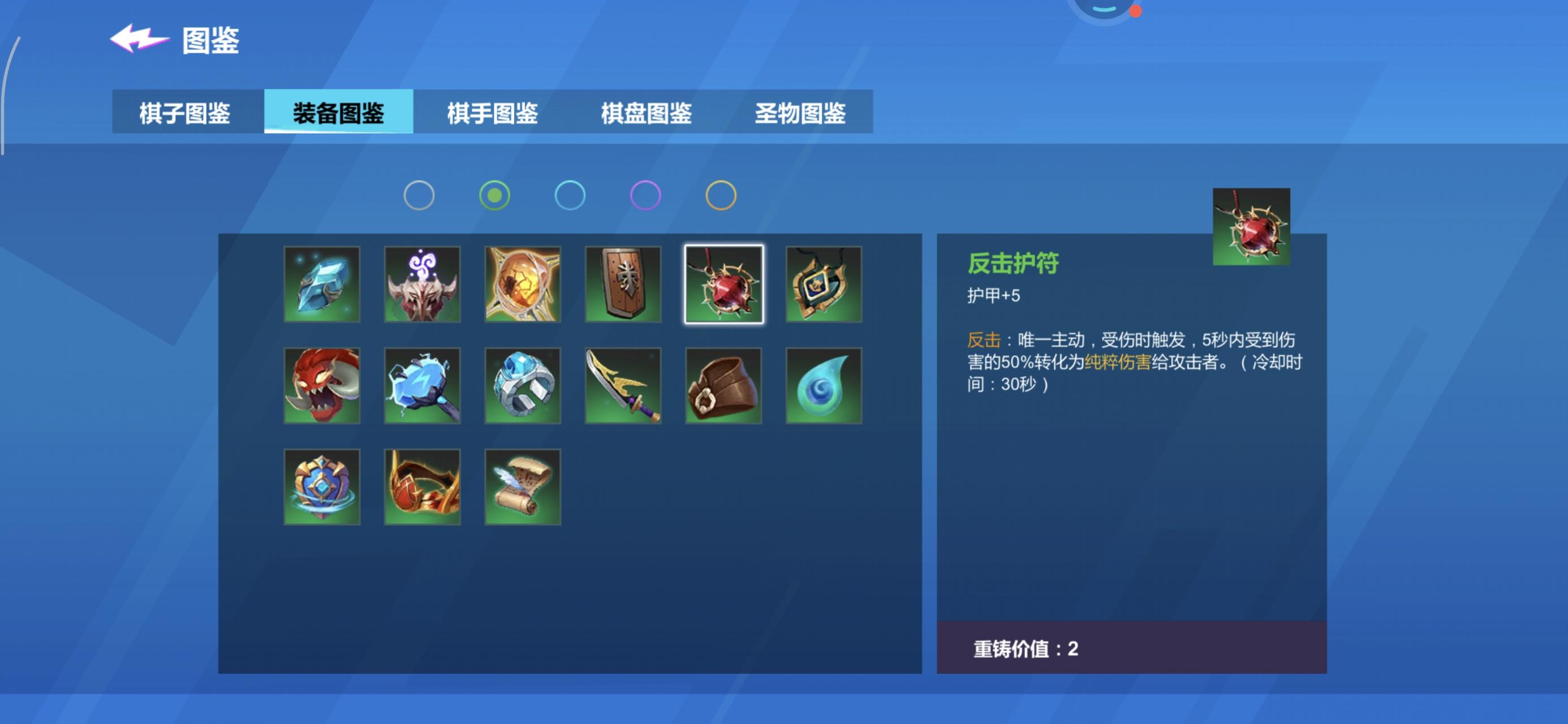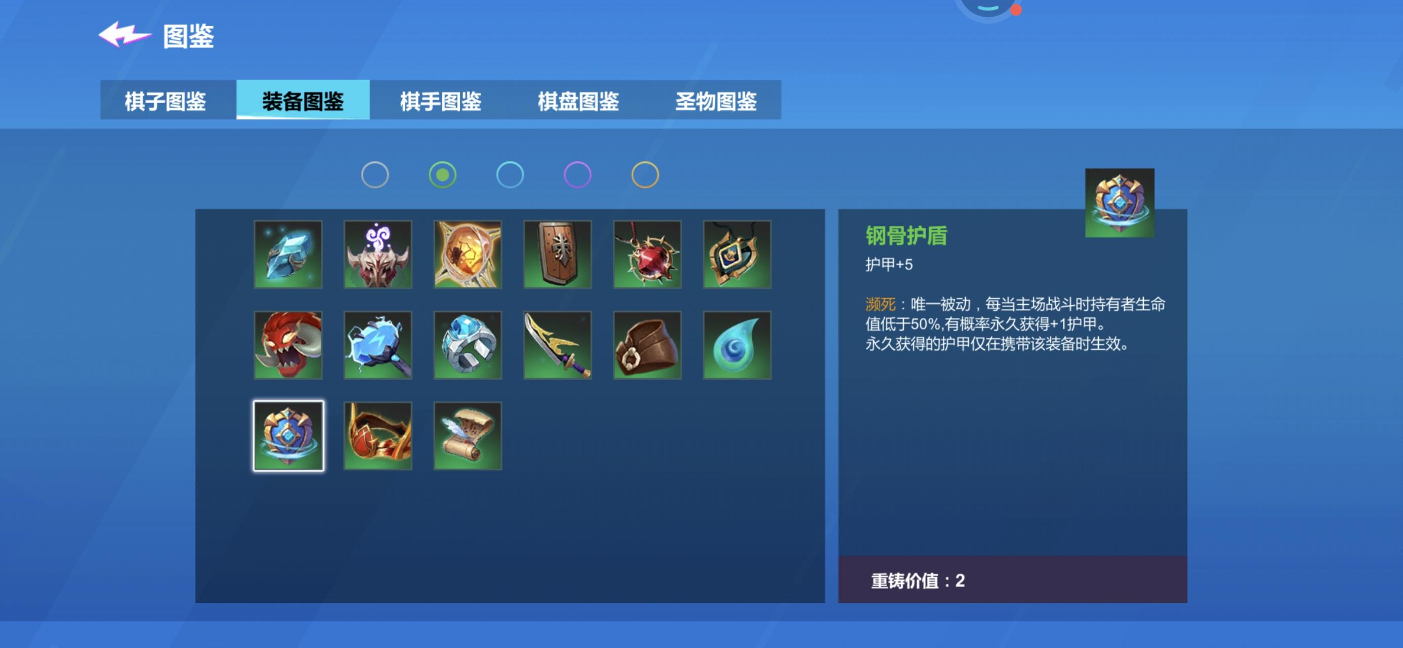 如图,反击护符和钢骨护盾基础数值相同,而钢骨护盾的被动即使第一个野怪回合戴上到40多回合结束,他被动层数也很难超过10层,作为一件成长性装备效果属实鸡肋。建议:①提高钢骨护盾被动触发概率,或者减少触发条件,回合结束佩戴棋子存活即触发②提高钢骨护盾的品质,增强基础数值并且增加触发概率③删除钢骨护盾