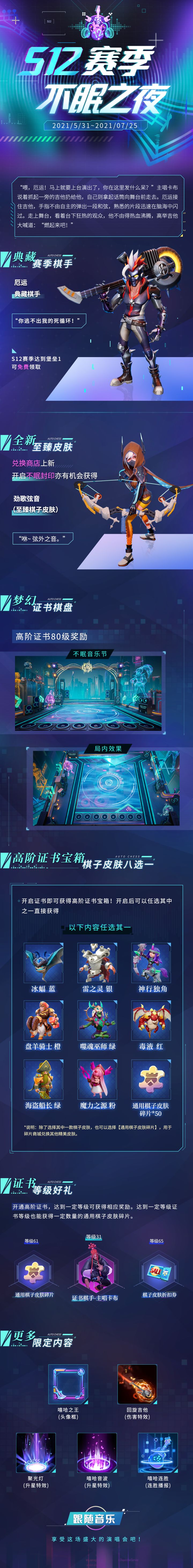 【S12赛季倒计时】不眠音乐节都有哪些好货?棋士证书更新内容一次看个够!🎵 兑换商店上新劲歌弦音,等我拉弓之时...🎵 高阶证书达到31级,零距离接触主唱卡布~🎵 回旋吉他伤害特效能量爆发!---------售票处提示:距离S12更新还有1天!