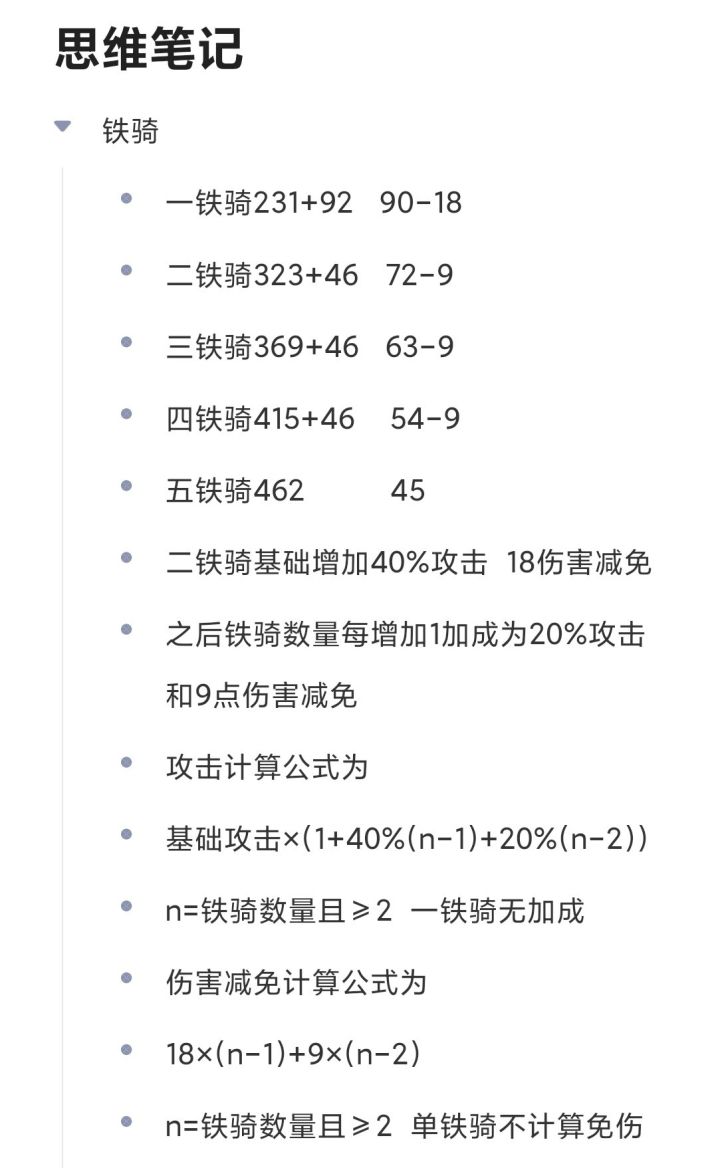 二铁骑基础增加40%攻击 18伤害减免之后铁骑数量每增加1加成为20%攻击 和9点伤害减免攻击计算公式为基础攻击×(1+40%(n-1)+20%(n-2))n=铁骑数量且≥2一铁骑无加成伤害减免计算公式为 18×(n-1)+9×(n-2)n=铁骑数量且≥2单铁骑不计算免伤