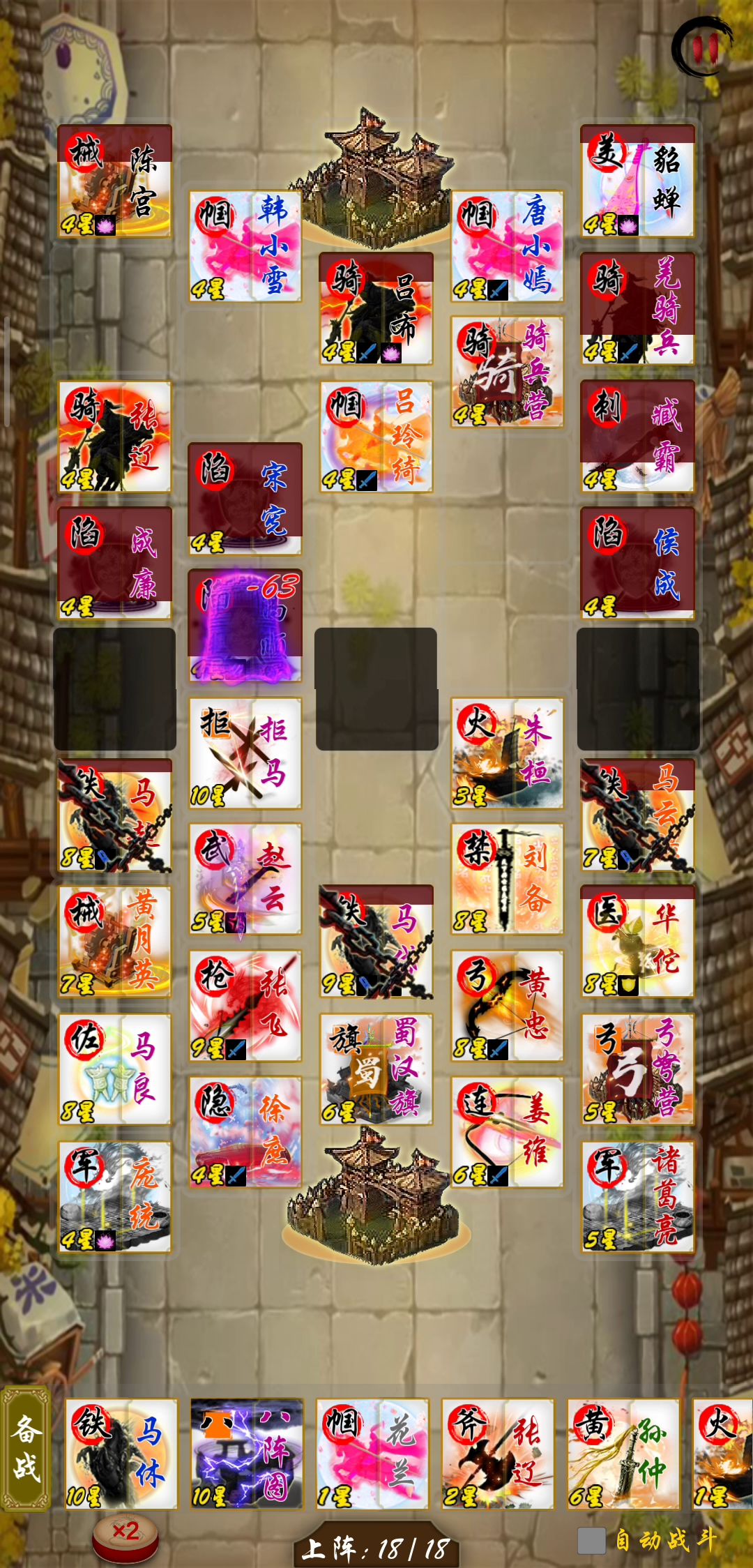 最右,碾压。主要思想是右路关羽张飞姜维赵云突破,配合诸葛庞统秒杀。中路必上马超,后期铁骑成型,基本挂不掉。有的朋友说,如果遇到拒马怎么办,这种阵型的严颜跟黄忠打出去的伤害还是挺可观的,包括地雷,打六个,如果脸不是太黑,也可以排掉。把华佗严颜换个地方更安全。 有缺点,箱子容易漏掉。有时候姜维一个爆发,能把基地秒了。蜀国的加特林,不知道为什么大家都觉得他不好。我认为他是最好用的武将了,打地雷拒马不怕,连击起来直接秒人。特别是打盾类的武将,一下攻击打掉盾,后面运气好直接四下,不占出手次数。蜀国麒麟儿,卡片又好出,很好养成的。后面配上了两次远征开箱子的成果,感觉红卡概率还是挺高的。