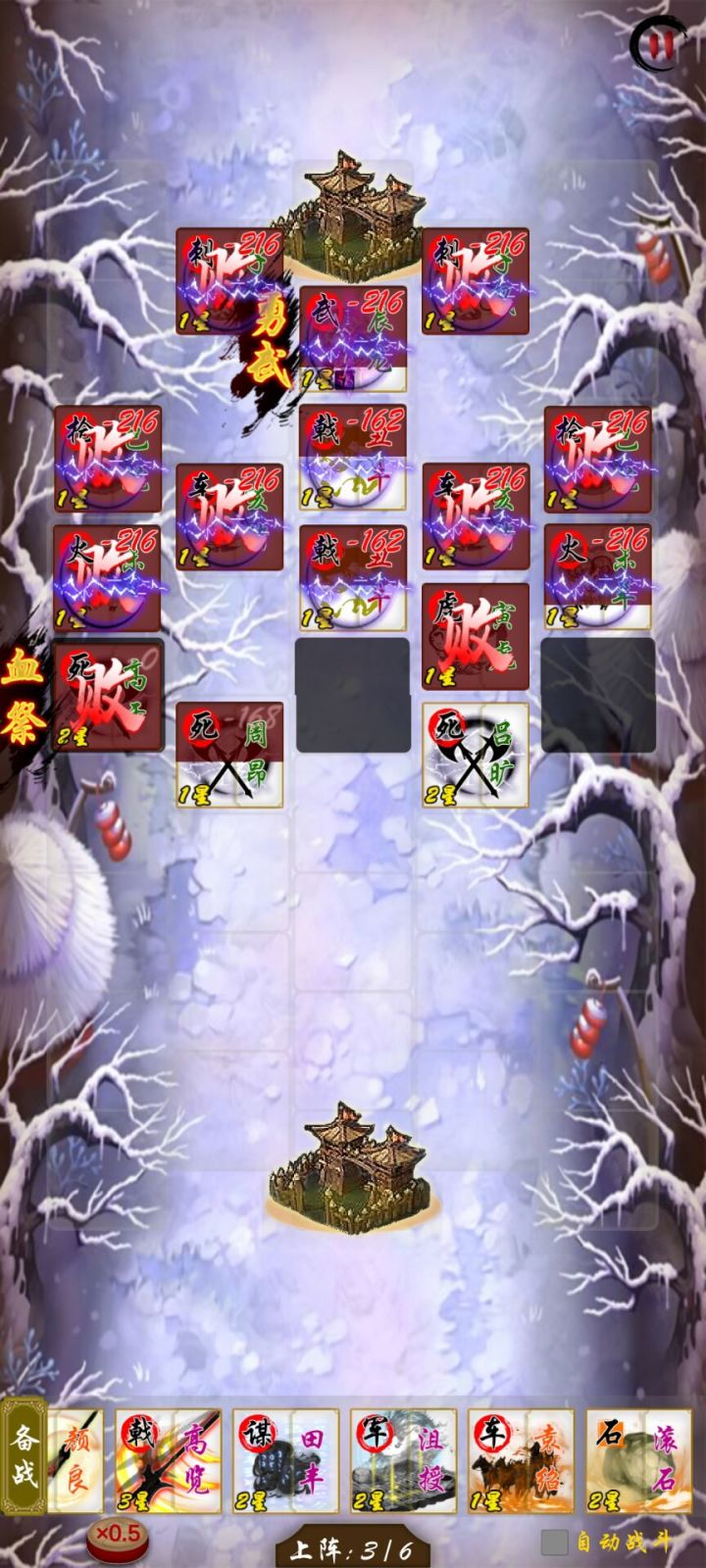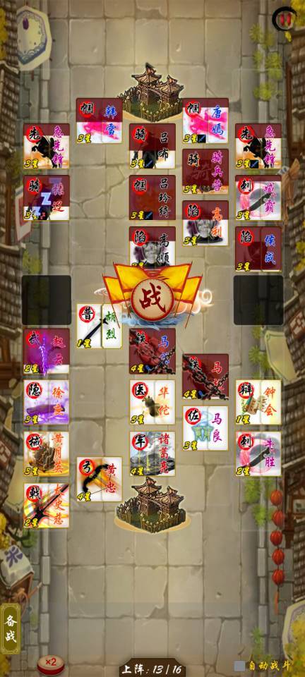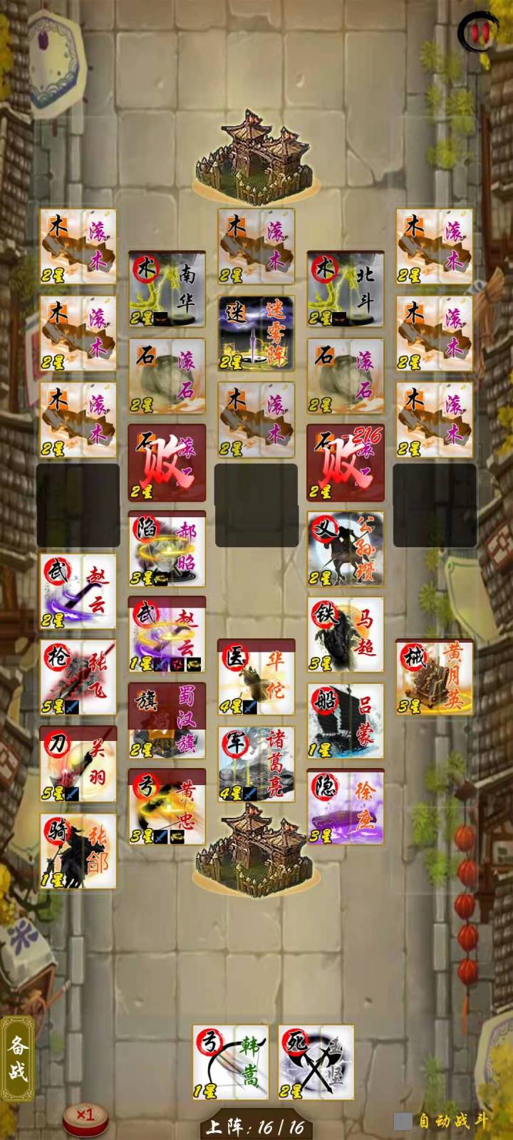 继续安利我的长蛇阵:远征中的BOSS(右路)关卡,不光奖励有惊喜,敌方阵容也有大惊喜。长枪阵、死士阵、刺客阵、火船阵、黄巾阵、铁骑阵……样样有惊喜……下一个会遇到那个阵,只有万恶的盘古知道,因此我方的阵形要有足够的灵活度。看看长蛇阵,刘备、马超身后先不上单位,遇到长枪阵、大戟阵之类殃及后排的,完全无战损通关。你说遇到刺客阵咋办?果断献出诸葛亮就行