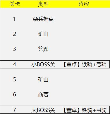 总篇:先看看炼狱2的关卡线路图第4关第7关铁骑的特性:连环的铁骑大军可谓能守能攻,前排不够硬的话,真心耗不起。再看看铁骑的特性,找找破绽。【铁骑】的效果为提升武力和物防,但没有提升法防。【连环】位置相邻会产生效果,但如果中间一个链子断开,连环效果就会大打折扣。根据以上,推荐出法术伤害类武将,比如诸葛、马谡、徐庶、庞统等。如果卡牌库里没有,商贾中也有机会拿到一些法术伤害类武将。弓