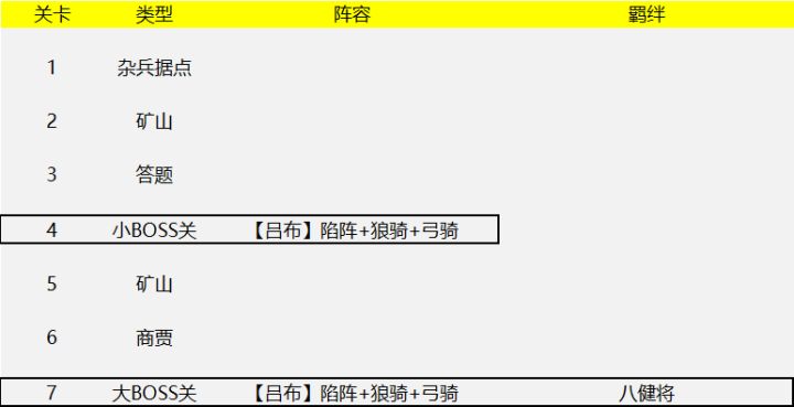总篇:先看看炼狱3的关卡线路图第4关第7关关卡点评:以狼骑、弓骑和陷阵为主力。对前排和后排都有一定杀伤力。整天来看,第7关和第4关差距不大,第七关增加了曹性,八健将到齐。虽然限定曹操军团,但几乎是白送的关卡。【狼骑】如果场上4匹狼全部发动战嚎,则最后行动的一匹狼可连续攻击5次。前排不够硬的话,防线很容易被撕开。【弓骑】这个之前介绍过,最强远程集火单位。场上一共2个,3个