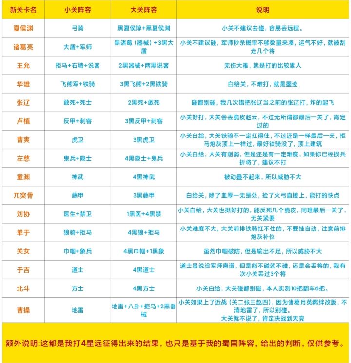 很早之前我已经说过了老关卡的难易程度,今天我来浅谈一下新关卡新关卡,我做了一个表,关卡阵容也列了出来。注意事项我也有表明,老关卡特意说了下曹操,因为诸葛月英羁绊改版,不能清地雷了,所以小关上了近战不建议去打。这羁绊一改版,金币获取就很麻烦,我的建议是远程能打的关卡,尽量上远程打,二爷没得必要上的时候,就不要上,不然二爷一上丢金币太严重了。PS:以上所有评价都是基于我蜀国阵容,给出的评价。难度
