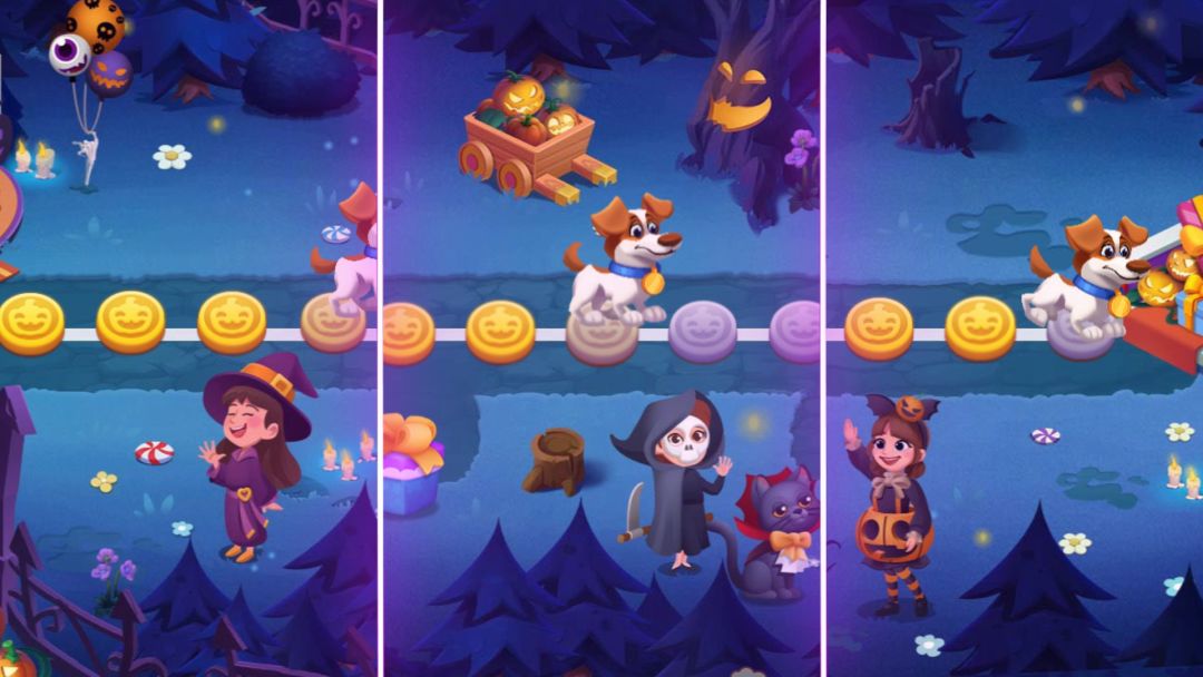 小风呼呼的吹呀,万圣节活动悄悄地来呀~ 👻不给糖,就捣蛋!搞怪奇趣的万圣节主题餐厅,蝙蝠棒棒糖、乌漆嘛黑意面,这些都是什么料理?! 【开启时间】:2022年10月15日~2022年11月6日 【活动玩法】:通过关卡→狗狗向前移动→获得对应奖励 【活动餐厅一览】 点上万圣节专属🎃南瓜灯,让我们来看看需要为顾客准备哪些节日料理? 颜色艳丽的苹果糖摆上,蜘蛛小饼干、小蝙蝠棒棒糖准备好,乌漆嘛黑意面配上南