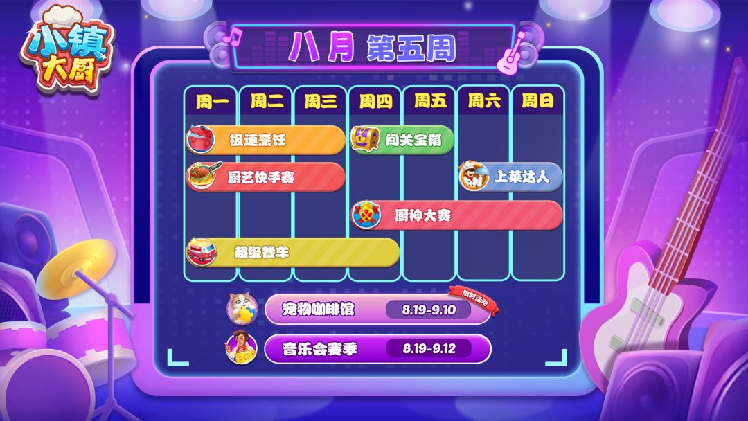 8月你好呀~ 点开本周活动日历,接收你的8月好运! 周一至周三「极速烹饪」「厨艺快手赛」开启 周末还有「完美填色」活动哦~