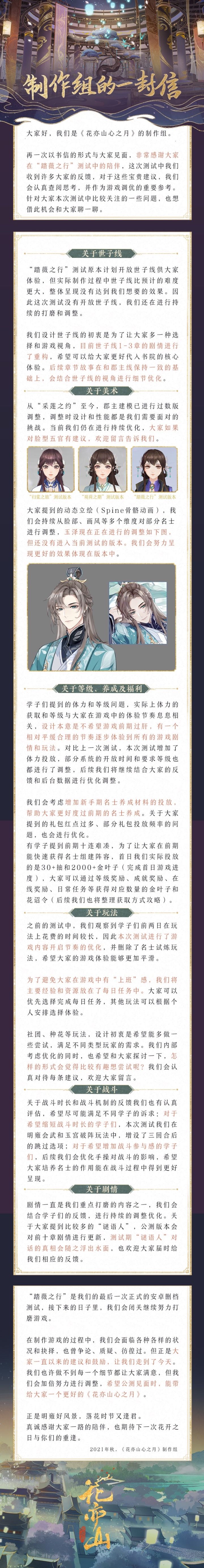 大家好,我们是《花亦山心之月》的制作组。再一次以书信的形式与大家见面,非常感谢大家在“踏薇之行”测试中的陪伴,这次测试中我们收到许多大家的反馈,对于这些宝贵建议,我们会认真查阅思考,并作为游戏调优的重要参考。针对大家本次测试中比较关注的一些问题,也想借此机会和大家聊一聊。“踏薇之行”是我们的最后一次正式的安卓删档测试,接下来的日子里,我们会闭关继续努力打磨游戏。希望公测见面时,能带给大家一