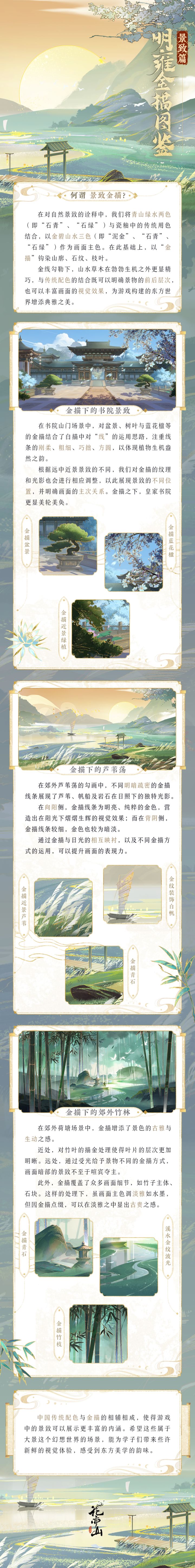 金石山水,古韵流转。大景世界中对自然景致的诠释,除运用金描,也会结合传统绘画技艺白描中对“线”的运用思路。如对植物进行金描时,会注重线条的刚柔、粗细、巧拙、方圆……这期金描图鉴景致篇,便为大家介绍二三大景世界中的景致金描细节。