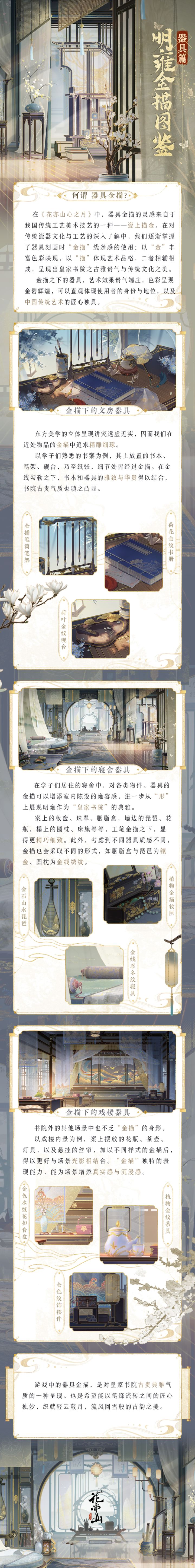 金描描形,颜彩入韵。除了万景金描PV中展示的部分府城金描场景,大景世界中其实还有许多金描细节,比如学子们的文房器具、寝舍用品等等。对器具细节的刻画,可以进一步从“形”上呈现明雍书院作为皇家书院的古雅和华贵。今天,带来一期器具篇金描图鉴,和大家分享一些游戏内的金描细节~