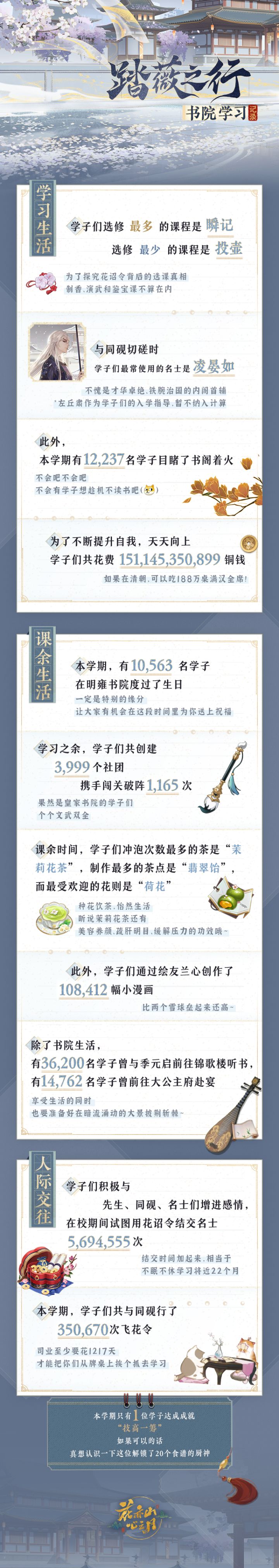 开学第一天,为大家带来“踏薇之行”学期的学习记录~本学期中,学子们依旧秉承德智体美劳全面发展的优良传统,专研课业的同时不忘提升身体素质、喝茶养生。听说不少学子都有和季元启前往锦歌楼听书的经历,更有部分学子目睹书院失火现场,不知道你印象深刻的场景有哪些呢?我们按惯例翻开了教导主任陈司业的记录册,一起来看看本学期的趣味记事吧~