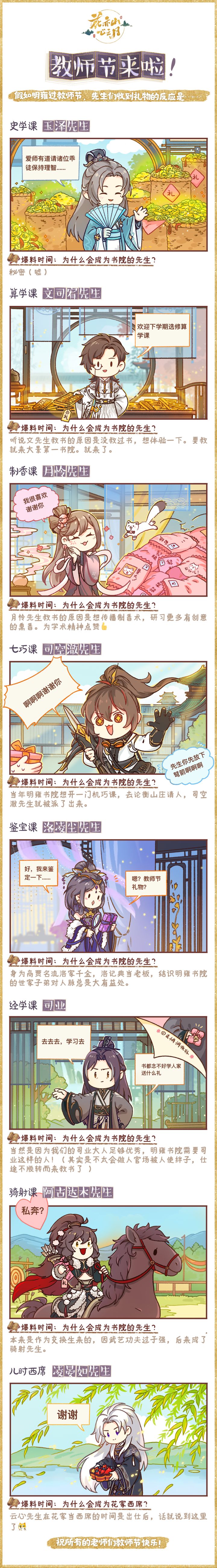 教师节到啦!按照书院院规,学子们是不能给书院的先生们送礼物的。但是在今天,教师节这个特别的日子,我们不禁也脑洞了一下,如果书院的各位先生收到学子们的礼物,会是什么样的反应呢?*内附特供小采访:大家成为先生的原因大揭秘一起来看看一下吧(手动狗头.jpg)↓↓↓