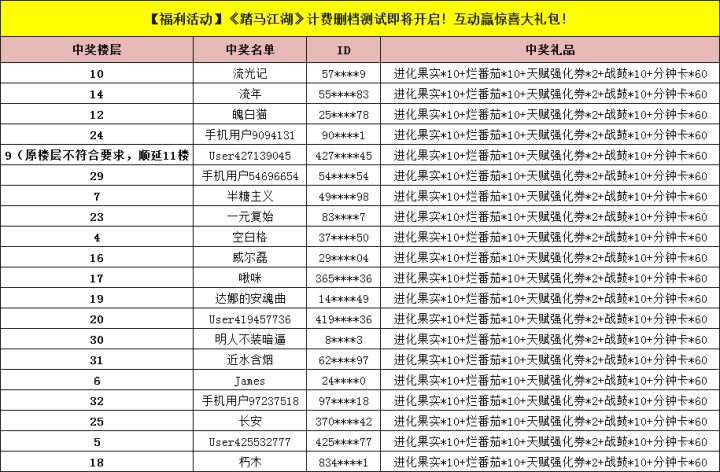 请获奖少侠在2022年4月13日24:00之前添加Q群:588903306联系群主兑奖 ,管理员会在截止兑奖前完成登记。各位少城主们晚上好吖,盈盈又又又来送福利啦!!!《踏马江湖》即将在4月07日开启计费删档测试!少城主只需评论对游戏的祝福即可参与抽奖!但不允许刷屏哦!!!随机抽取20位少城主送出惊喜大礼包。(礼包内含:进化果实*10+烂番茄*10+天赋强化券*2+战鼓*10+分钟卡*60