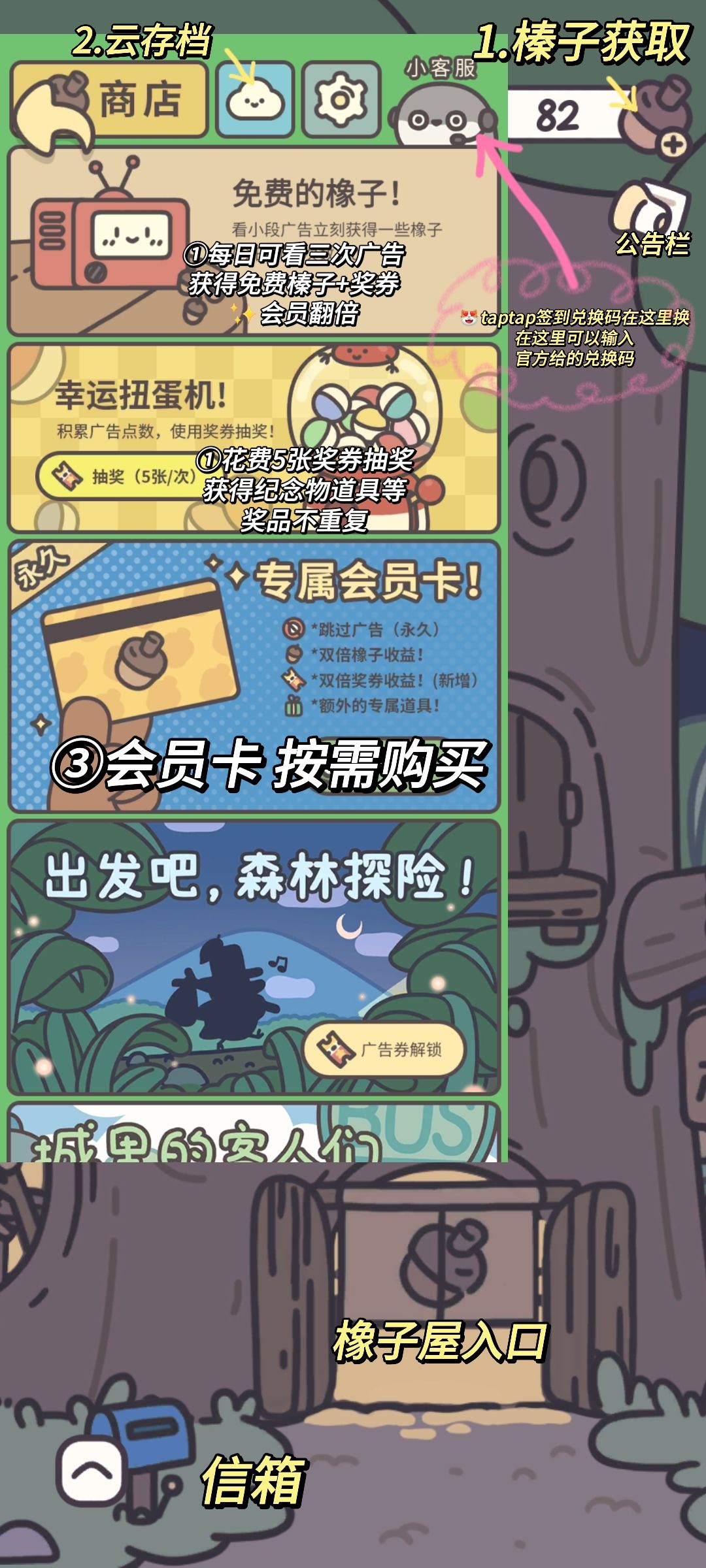 1.游戏总体定位 首先在介绍游戏具体内容之前,先讲一讲这个游戏大概的一个定位~橡子屋这个游戏我个人感觉是一个休闲养成的游戏(类似于旅行的青蛙🐸)即使是像我特别肝游戏的人,也会“被迫”慢下来[表情_猫咪举手]游戏时间和现实时间一样,客人会隔一段时间来,广告也仅有三次💕游戏的亮点在于每次登录的时候都会有不一样的惊喜,借用官方的话就是慢一点,时间会给你答案 2.游戏设施 (图1)橡子获取+云存档+兑换码