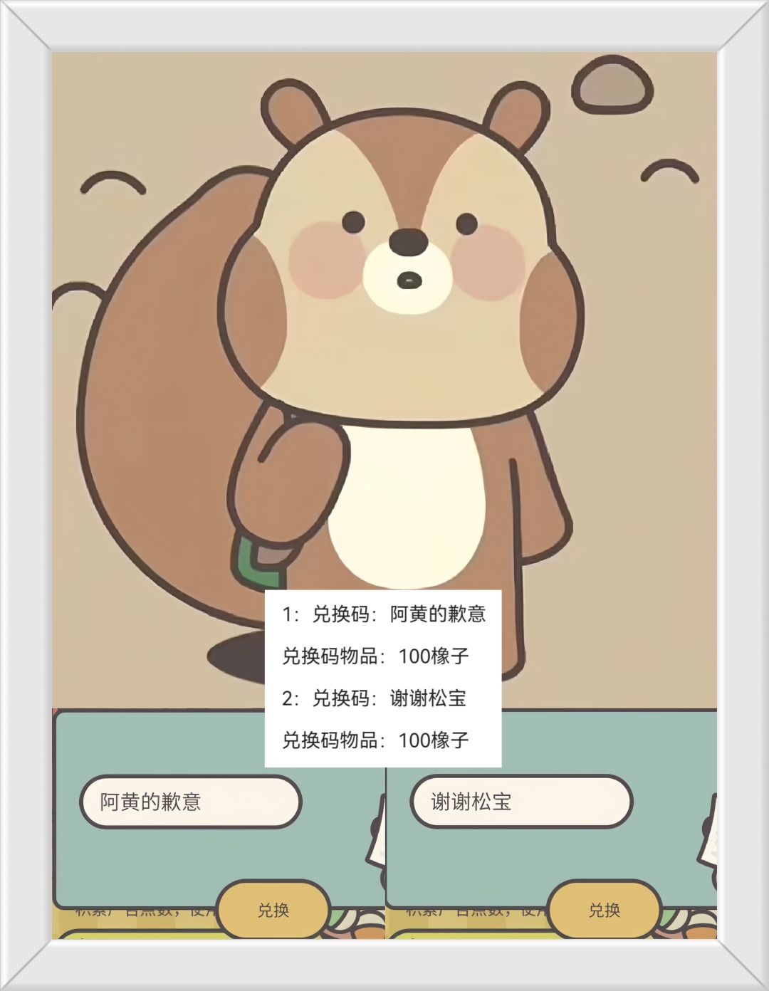 兑换码:阿黄的歉意 100橡子 附赠一只刷牙的乖乖松(づ ̄ ³ ̄)づ 出新兑换码了,还是100橡子 兑换码:谢谢松宝