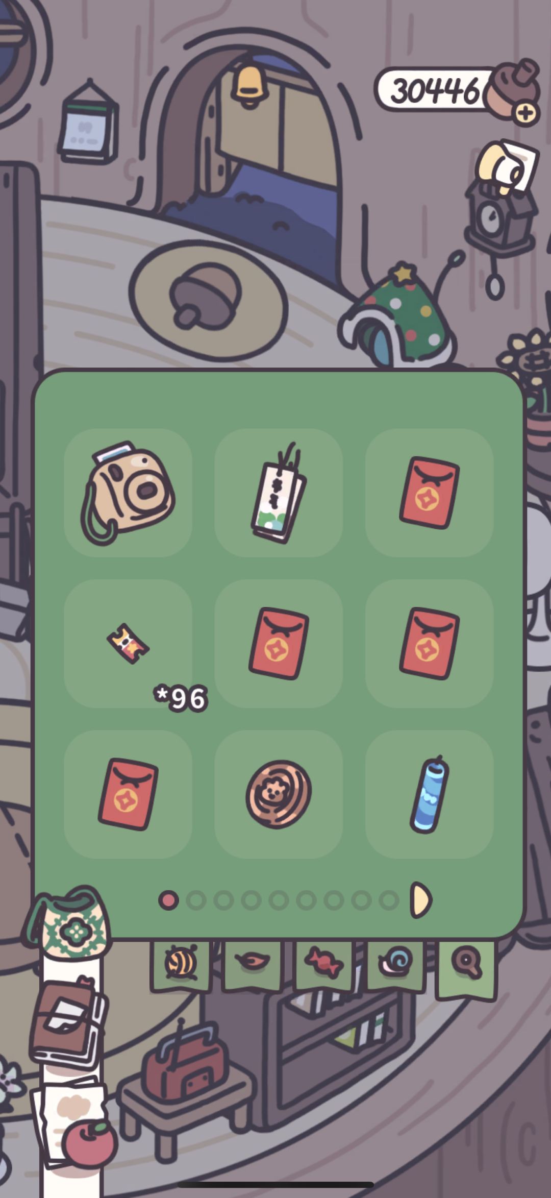 第一日买完后,第二日菜单和杂货摊 菜谱总计 420橡子 卡卡的杂货摊 710橡子 1.花盆:购买后会送三包种子,然后就会成为一个树屋的摆设,点击浇水,它会慢慢发芽开🌺 2.纸风车:购买后会要求获取麦克风权限,授予后,对着手机吹风会转动(emmmm…有点无聊啊哈哈) 3.乡村菜谱:会给三张菜谱 凉粉 鱼鱼面 葱花面 不愧是最贵的,但是食材还没解锁 4.今天爷爷会送“水波蛋”食谱,记得买鸡蛋哦,注意查