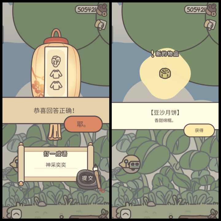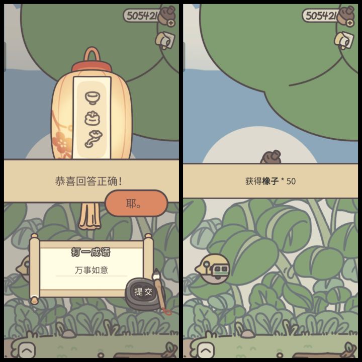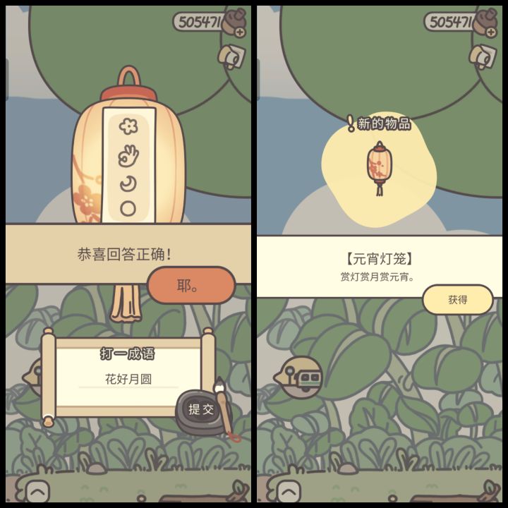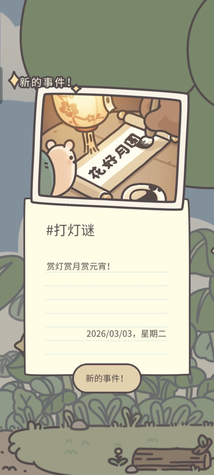 日记:《打灯谜》,2026.03.03收到游戏制作组的信后获得“迷题灯笼”,打开后会获得7个小灯谜灯笼。“花好月圆”灯笼(图五)会获得日记《打灯谜》和一个“元宵灯笼”可以挂在橡子屋门口,其他的灯谜灯笼都只能开出烟花或者零食,我自己留了两个灯笼没开做纪念136篇日记详情(持续更新)https://www.taptap.cn/moment/637241520008726376?s