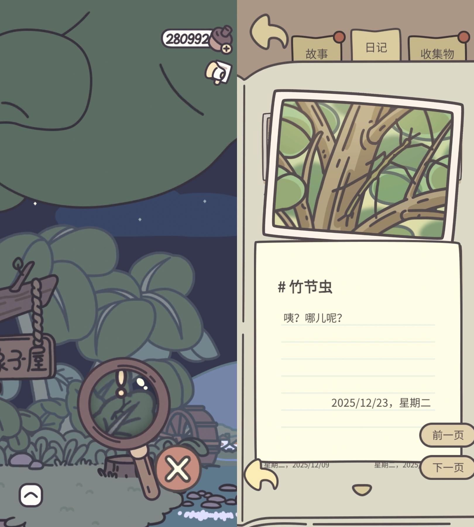 (对了,感谢论坛的图,有几张图我没截图到,在论坛里找的昆虫位置图)找昆虫玩法,先在背包里找到,放大镜🔍,然后在树屋外找不一样的地方,找到昆虫时放大镜里会有个❗️图标,对齐后会自动记录弹出日记。目前来看的话大概是七天会有一个新昆虫日记(不清楚遇到的顺序固不固定,暂且来说是这些位置),还有一点外出场景的昆虫日记不影响刷新时间。还有遇到昆虫可能有些需要在不同时间段,好像西瓜虫跟屎壳郎那样,我早上跟中午