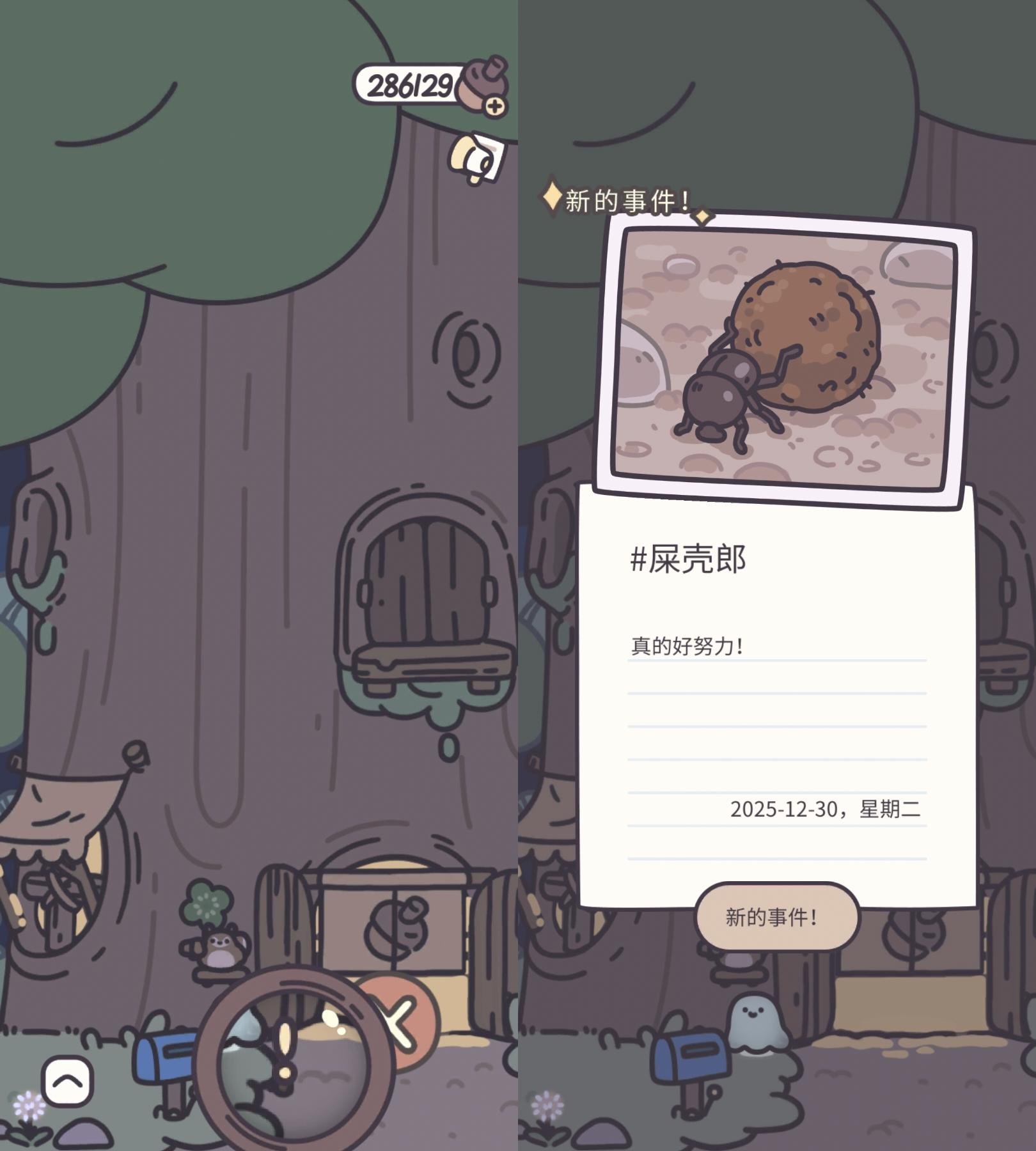 (对了,感谢论坛的图,有几张图我没截图到,在论坛里找的昆虫位置图)找昆虫玩法,先在背包里找到,放大镜🔍,然后在树屋外找不一样的地方,找到昆虫时放大镜里会有个❗️图标,对齐后会自动记录弹出日记。目前来看的话大概是七天会有一个新昆虫日记(不清楚遇到的顺序固不固定,暂且来说是这些位置),还有一点外出场景的昆虫日记不影响刷新时间。还有遇到昆虫可能有些需要在不同时间段,好像西瓜虫跟屎壳郎那样,我早上跟中午