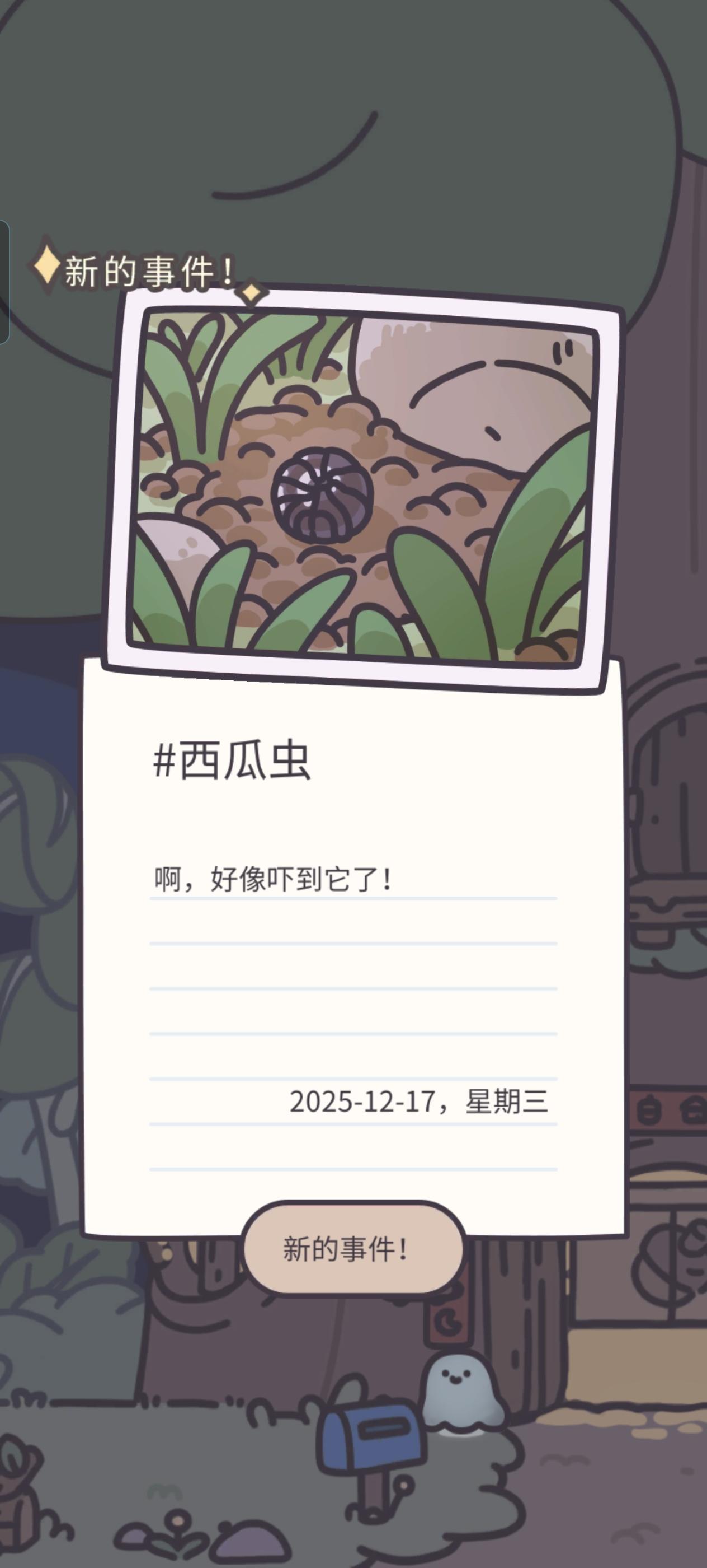 日记《西瓜虫》橡子屋门口邮箱下面的石头上发现一个小黑虫,用放大镜观触发该日记 123篇日记详情(持续更新)https://www.taptap.cn/moment/637241520008726376?share_id=c426040a0503&utm_medium=share&utm_source=copylink