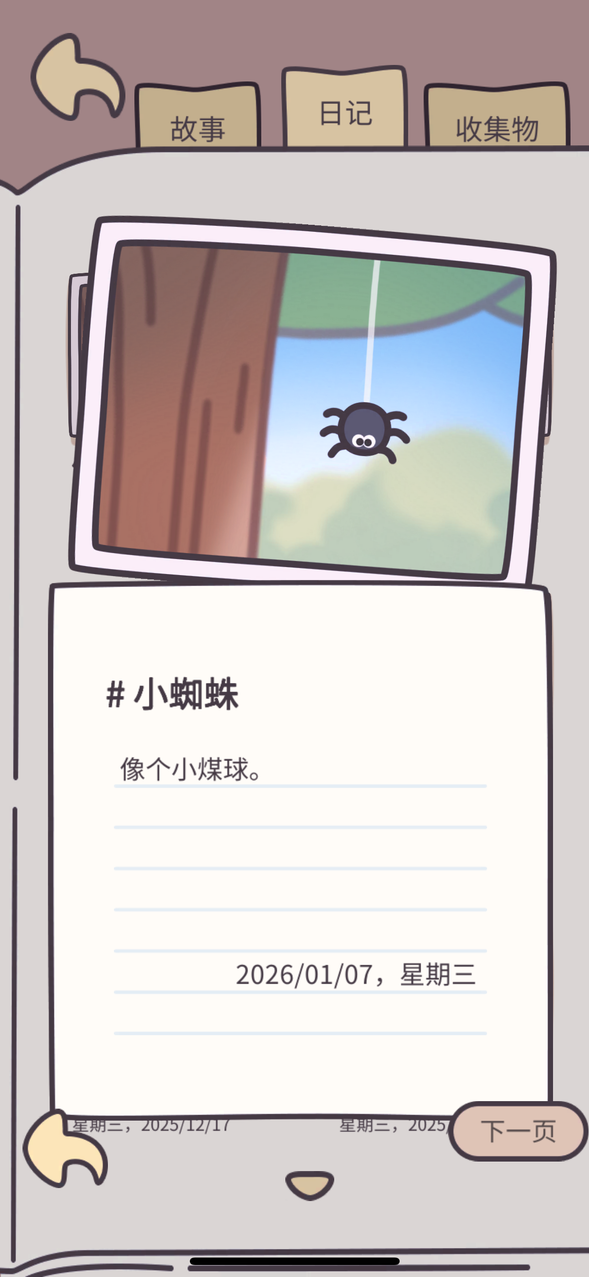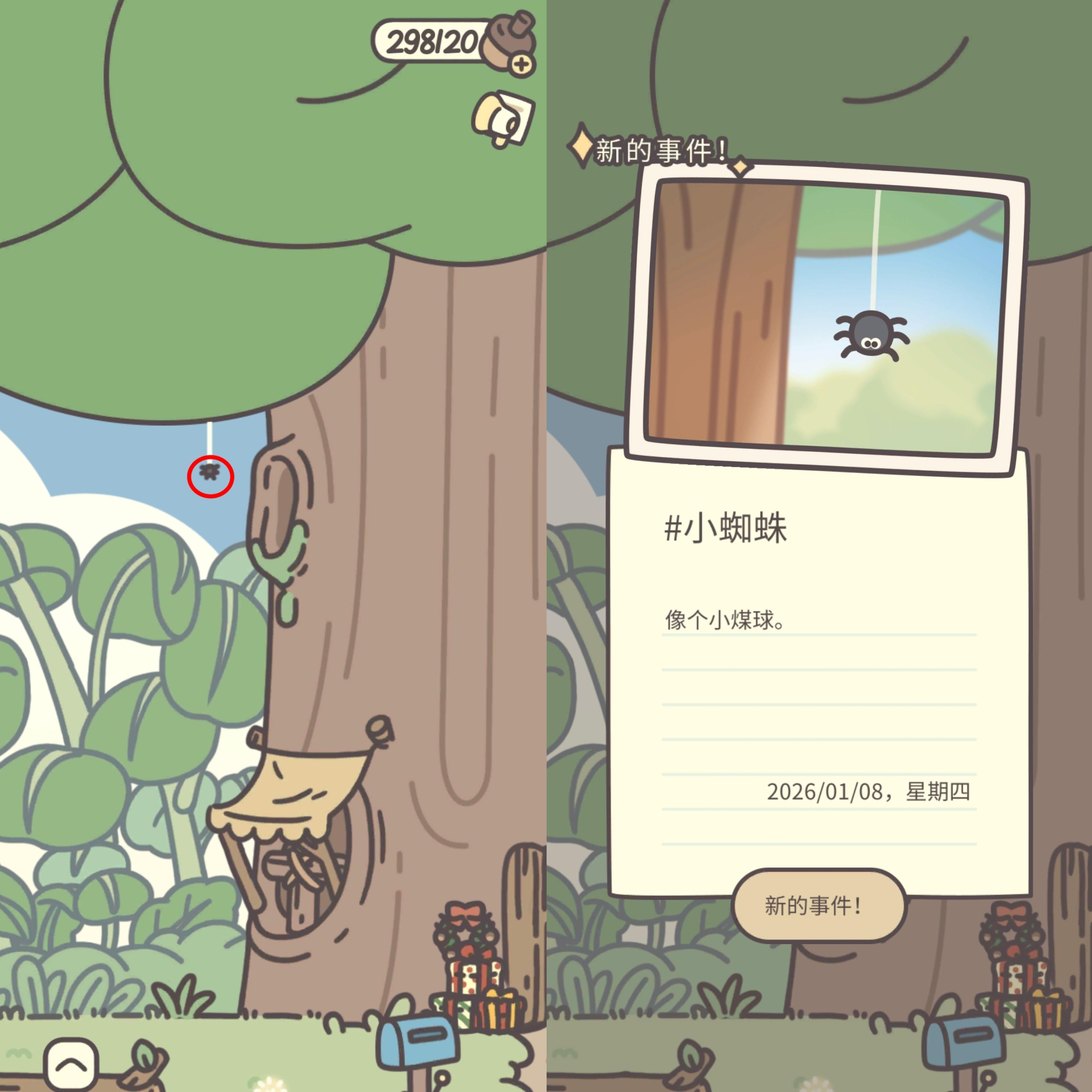 (对了,感谢论坛的图,有几张图我没截图到,在论坛里找的昆虫位置图)找昆虫玩法,先在背包里找到,放大镜🔍,然后在树屋外找不一样的地方,找到昆虫时放大镜里会有个❗️图标,对齐后会自动记录弹出日记。目前来看的话大概是七天会有一个新昆虫日记(不清楚遇到的顺序固不固定,暂且来说是这些位置),还有一点外出场景的昆虫日记不影响刷新时间。还有遇到昆虫可能有些需要在不同时间段,好像西瓜虫跟屎壳郎那样,我早上跟中午