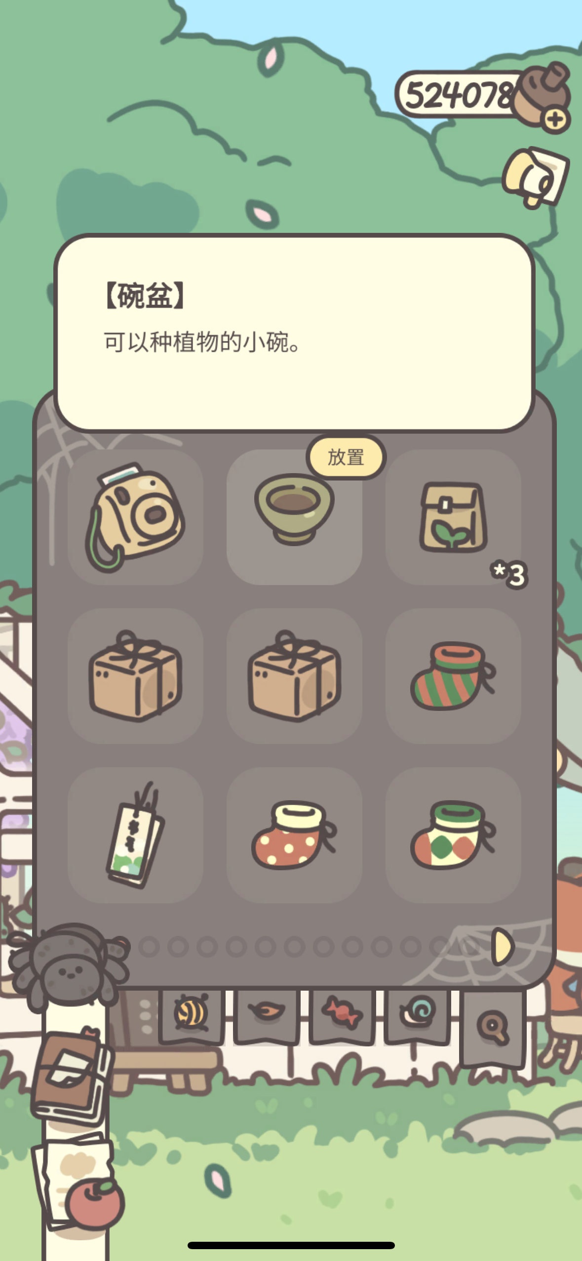 (对了,感谢论坛的图,有几张图我没截图到,在论坛里找的昆虫位置图)找昆虫玩法,先在背包里找到,放大镜🔍,然后在树屋外找不一样的地方,找到昆虫时放大镜里会有个❗️图标,对齐后会自动记录弹出日记。目前来看的话大概是七天会有一个新昆虫日记(不清楚遇到的顺序固不固定,暂且来说是这些位置),还有一点外出场景的昆虫日记不影响刷新时间。还有遇到昆虫可能有些需要在不同时间段,好像西瓜虫跟屎壳郎那样,我早上跟中午