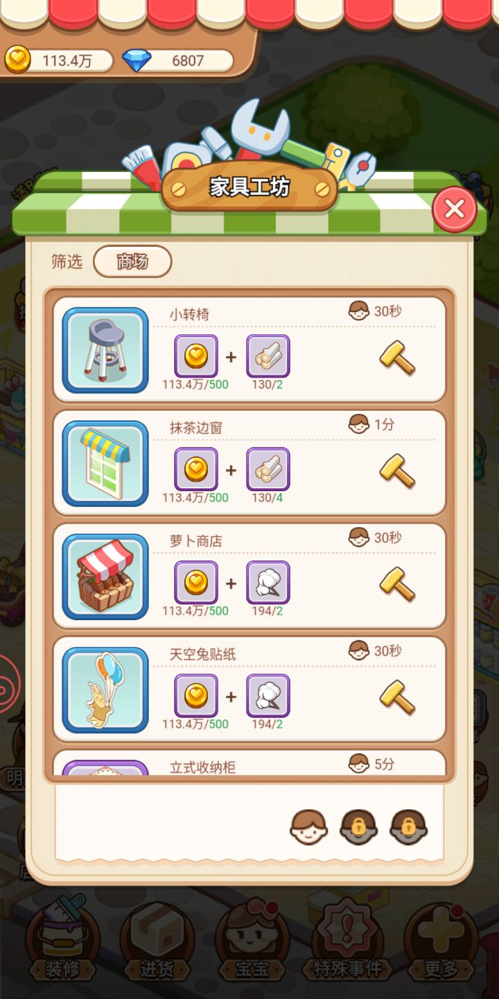 真·秘笈 《宝宝超市》特色装饰获取途径《宝宝超市》盛大开业,如何聚揽超高人气,让超市门庭若市?很简单,在超市里摆放更多的各类装饰,就可以不断增加人气值,让你的超市热闹非凡。那么,如何获取装饰呢?今天小编就来告诉大家获取特色装饰的几种方法。1. 家具工坊在《宝宝超市》中,最通常的获取装饰的方式就是通过“家具工坊”来制作,我们可以通过消耗金币、棉花、胶水、桦木、松木等材料,就可以制作各类装饰,粉